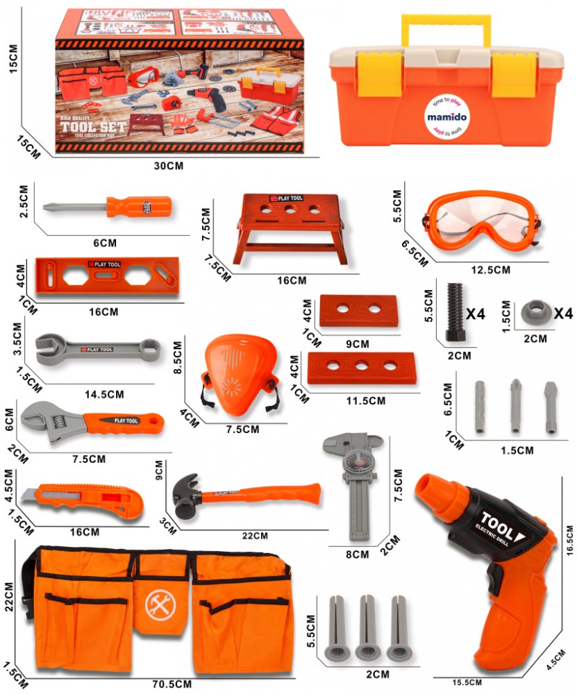 Nastartuje fantazii a hravé učení. Kompletní sada nářadí s kufříkem, aku vrtačkou, kladivem, šrouby, brýlemi, pracovní vestou, páskem na nářadí a dalšími doplňky. Ideální pro hraní na dílnu, učení se rozpoznávat nástroje a rozvoj jemné motoriky. Díky kufříku je možné všechny dílky snadno uklidit a přenášet.