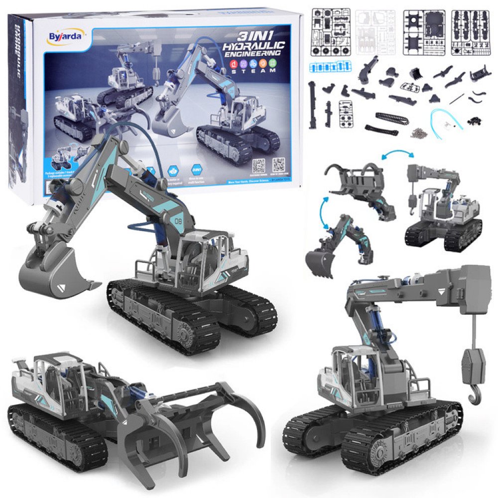 Sada 3v1 postav stavební vozidla s hydraulickým pohonem, je nabídka pro děti již od 8 let. Neobyčejná stavebnice 3v1, vytvořená speciálně pro mladé nadšence do mechaniky.