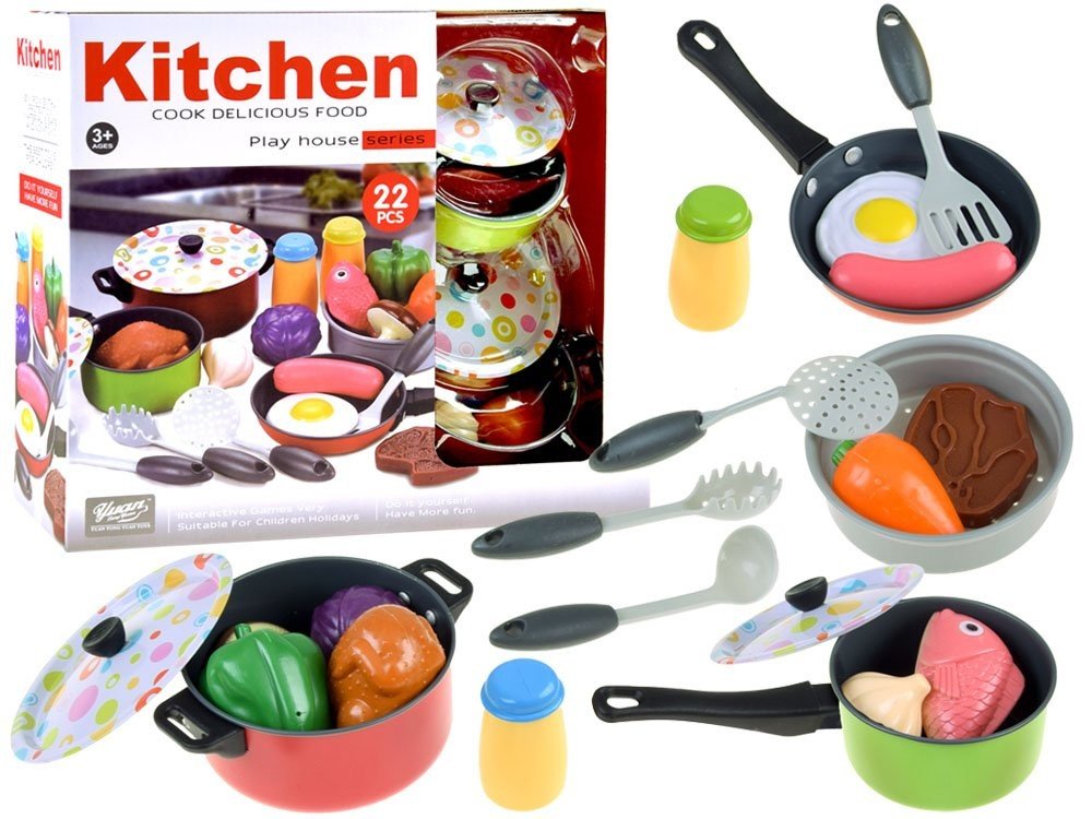 Sada nádobí a potravin obohatí každou hru s dětskou kuchyňkou. Dětská sada se skládá z 22 dílů. Obsah balení: Velký hrnec Hrnec Pánev Dvě pokličky Cedník Čtyři kuchyňské náčiní Zelenina: Červená zelí, paprika, česnek, mrkev, houby Kuře, ryba, párek, vejce, maso Dvě kořenky Rozměry: Velký hrnec: 5 x 10 cm Hrnec: 4 x 8,5 cm Pánev: 2 x 10 cm Cedník: 3 x 10 cm