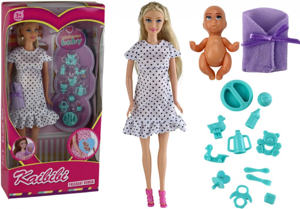 Těhotná panenka v bílých tečkovaných šatech Panenka má dlouhé krásné černé vlásky. Oblečené má bílé tečkované šaty a na nohou má obuté růžové lodičky. Panenka má pohyblivé končetiny. Rozměry panenky: 30 cm x 7 cm x 5 cm Rozměry malé panenky: 3,5 cm x 2 cm x 1 cm Velikost balení: Rozměr 33 cm x 10 cm x 6 cm Hračka má certifikát CE a je vhodná pro děti od 3 let.