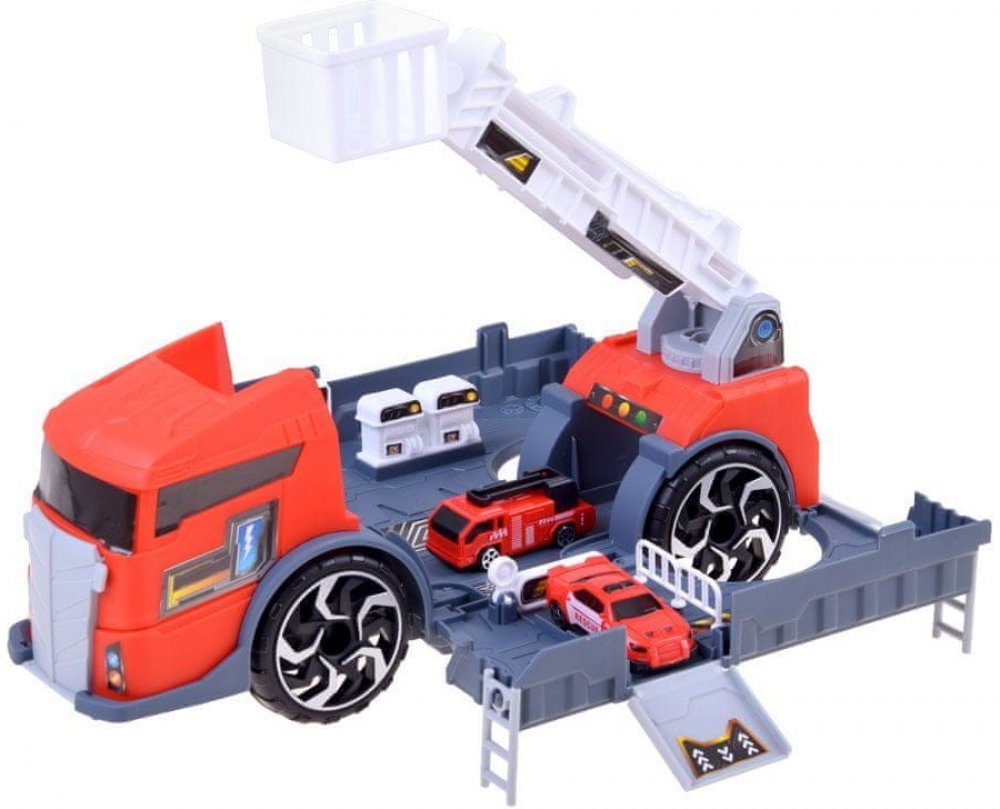 Super multifunkční kamion s velkými koly v červené barvě. Konstrukce vozidla a automobilů umožňuje použití mnoho způsoby, například jako garáž, odtahovka či výtah. Kamion má otevírací dveře po stranách a jde úplně rozložit, aby nákladní prostor kamionu sloužil jako parkoviště či garáž. Zvedák kamionu s košem je pohyblivý. Celá sada byla vyrobena z kvalitních materiálů s důrazem na detail. Sada obs...