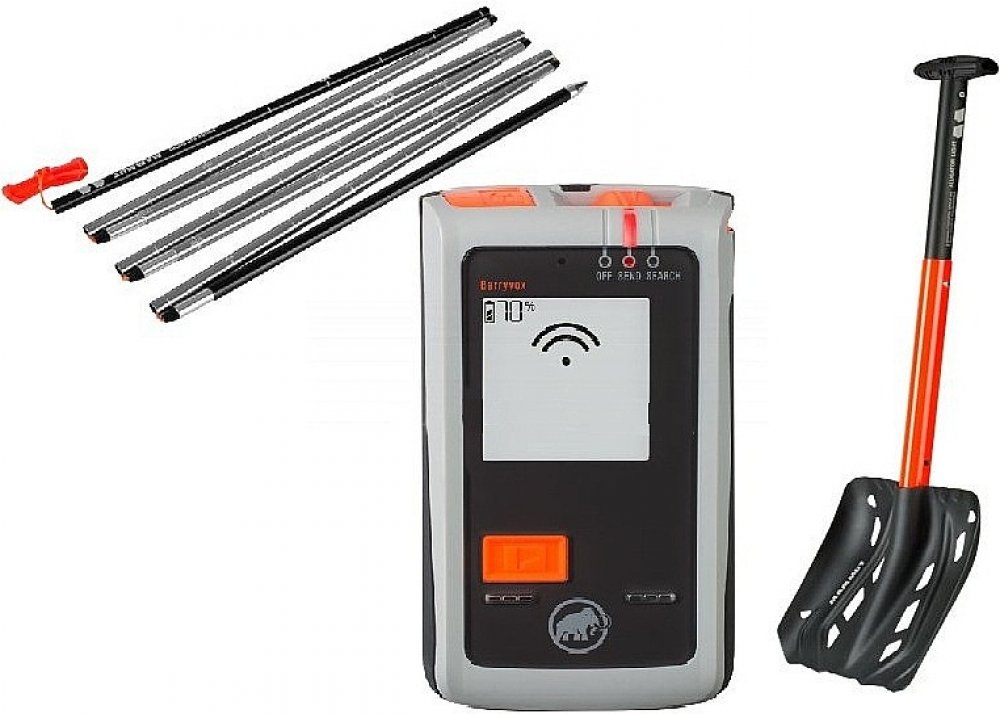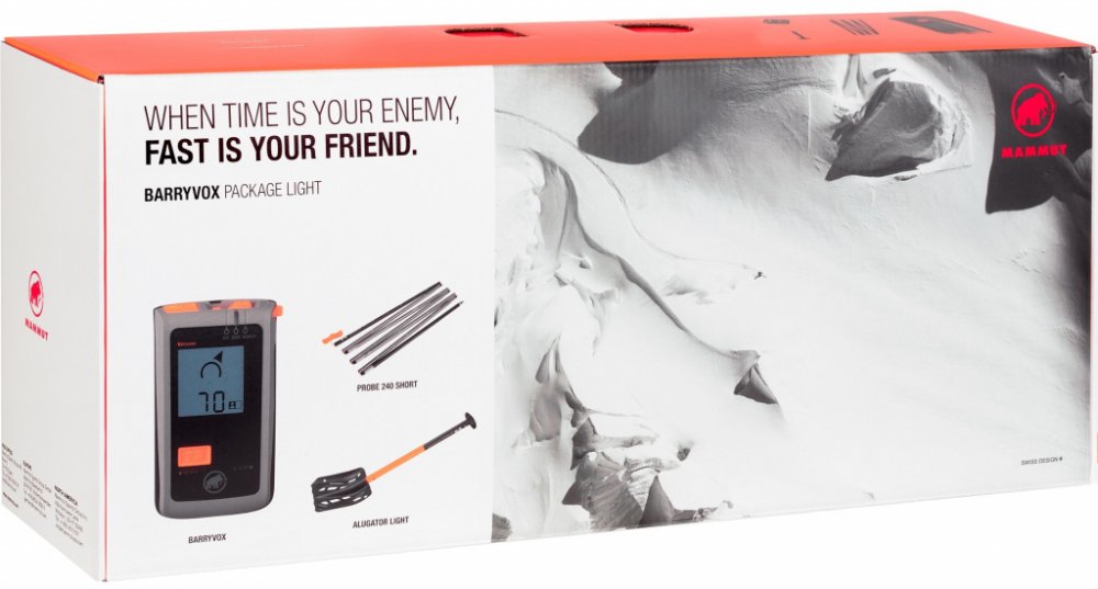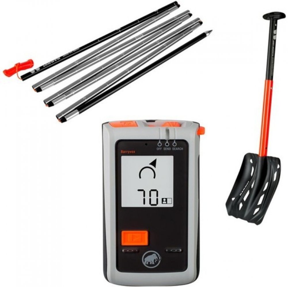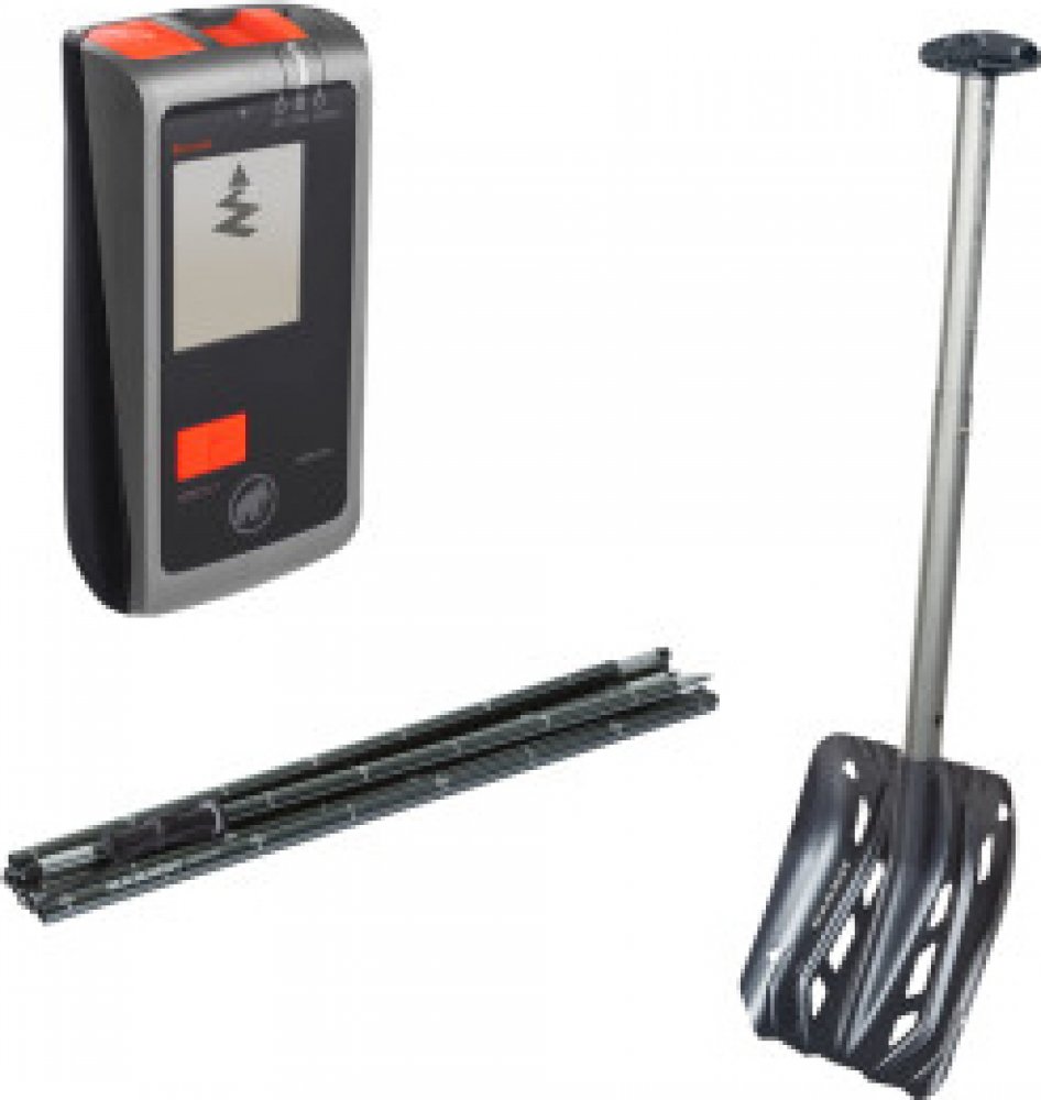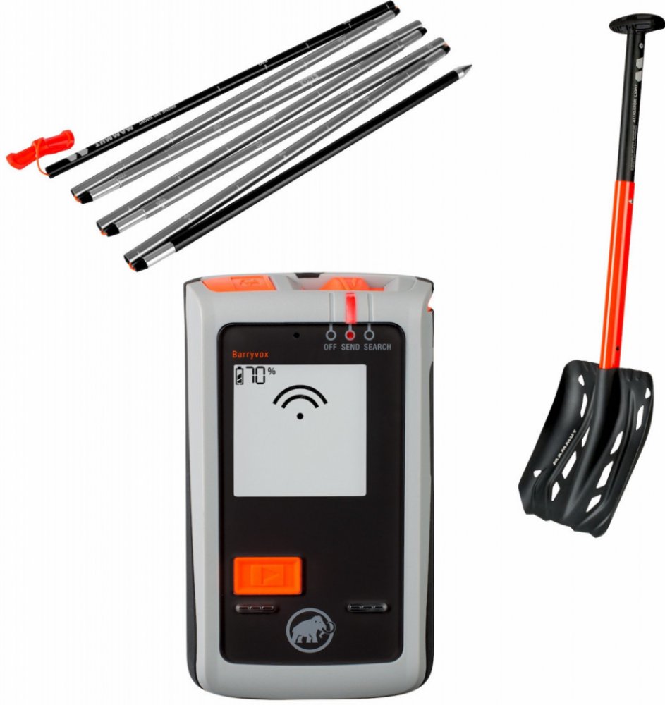... je tento lavinový set od Mammut. Teleskopická sonda Probe 240 short o váze 1 g na 1 cm, lavinový vyhledávač Barryvox s nejlepším dosahem a teleskopická, pevná a lehká lopata Alugator Light. Set je skladný a potěší závodníky i freeridery.