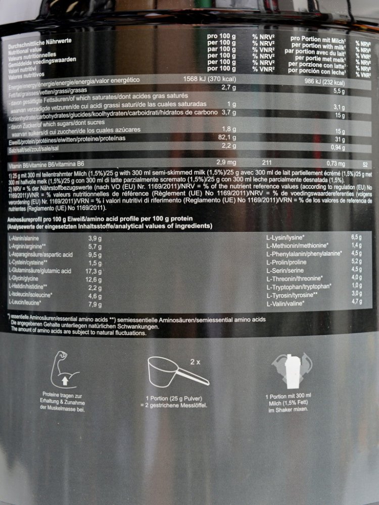 - Rozmíchejte 25g s 300 ml polotučného mléka nebo vody. Nejlépe užívejte po tréninku.