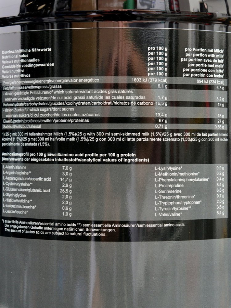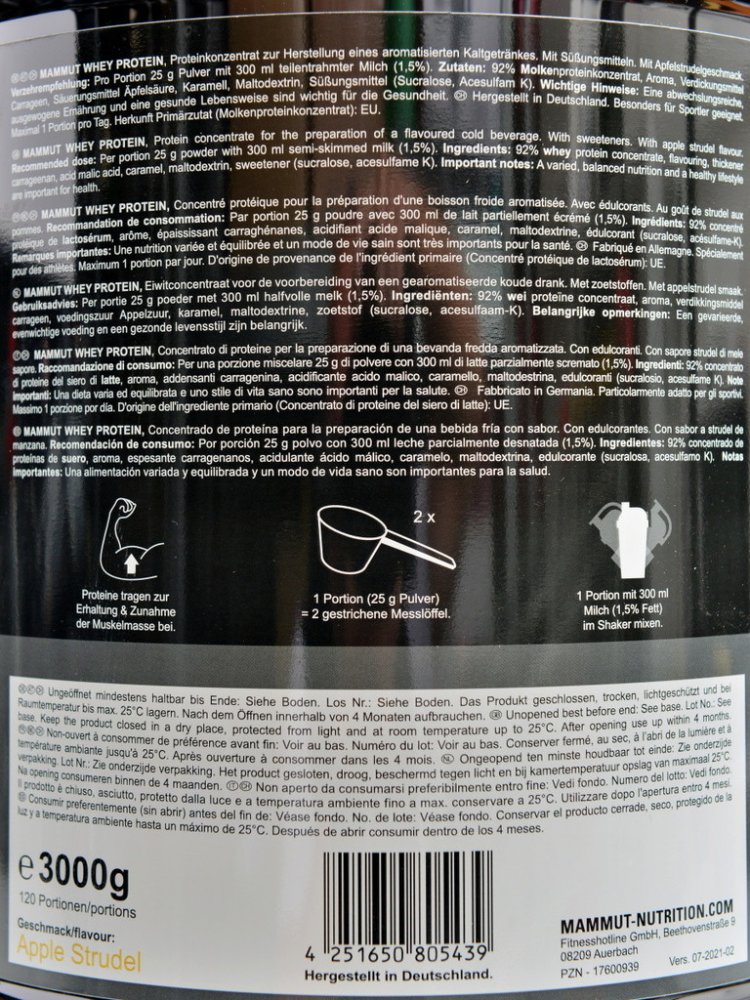 Mammut Nutrition 3000 g syrovátkové práškové 18.0 g 25.0 g 120 ks 95.5 kcal sucralóza, acesulfam K, lecitin, maltodextrin koncentrát syrovátky, aroma, sladidlo 8.333333333333334 g/100 ml