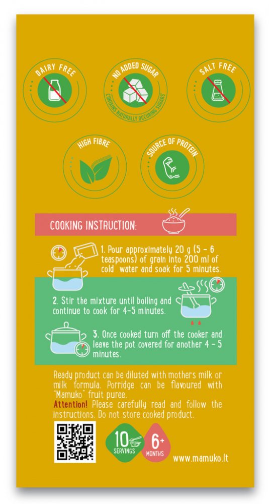 Ze sáčku odsypeme 4 až 5 čajových lžiček výrobku do hrnce s 200 ml studené vody a necháme 5 minut odstát. Směs poté mícháme až je přivedena k varu a pokračujeme v míchání po dobu vaření 4 až 5 minut. Poté sporák vypneme a kaši necháme dojít pod pokličkou po dobu dalších 4 až 5 minut. Hotovou kaši lze ředit mateřským mlékem nebo mléčnou výživou. Můžete také dochutit Mamuko ovocným pyré nebo tak, jak to máte rádi :-)
