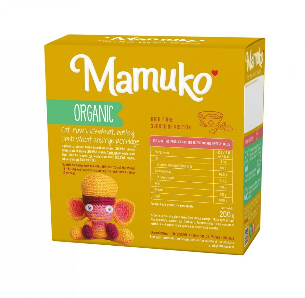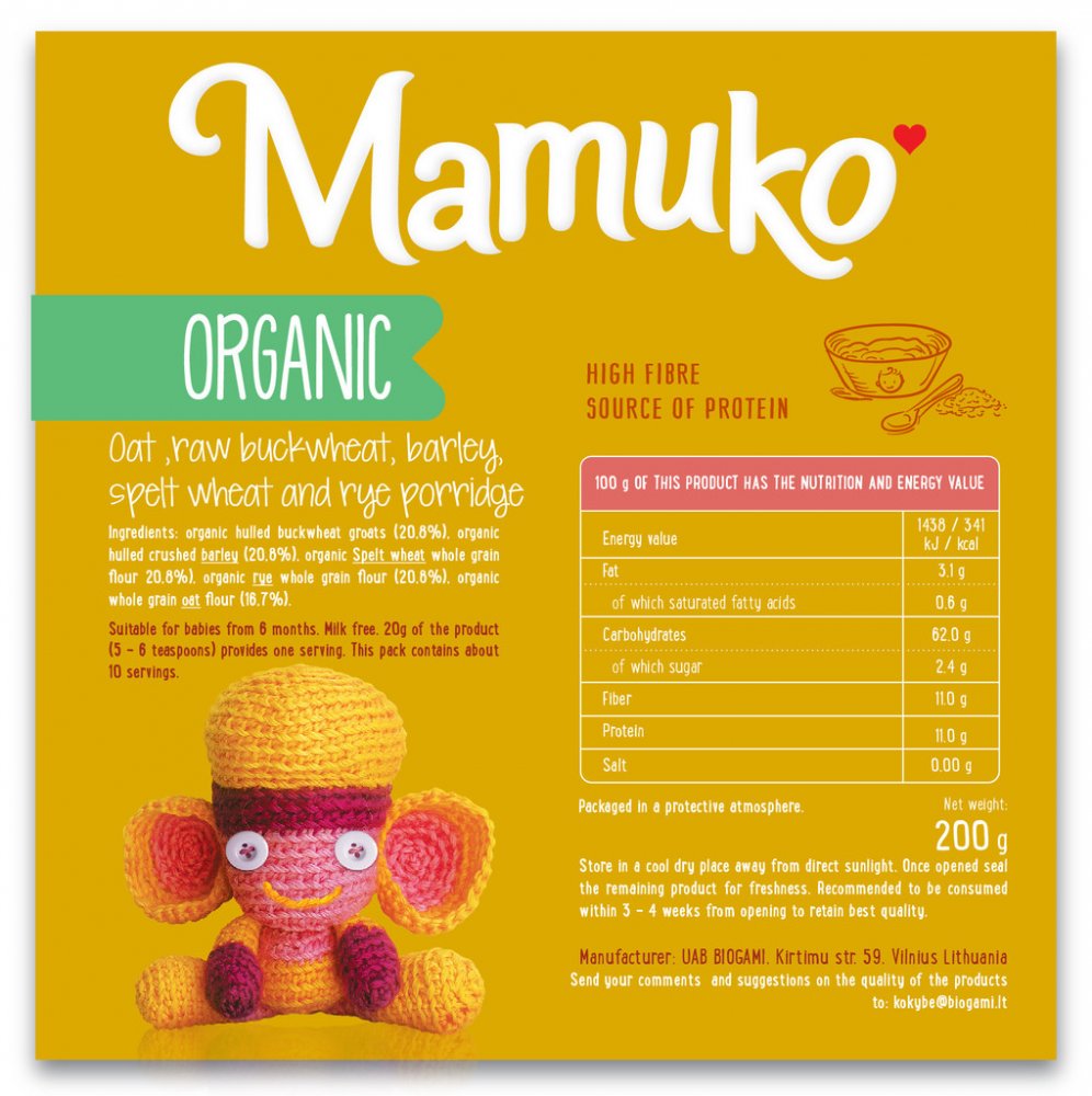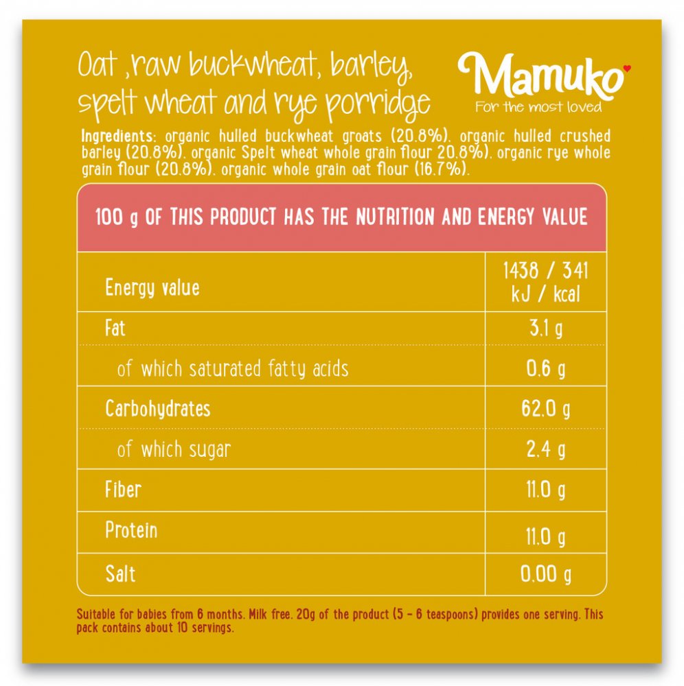 Speciální neinstantní celozrnná bio potravina pro děti od 6 měsíců. Velmi vysoký obsah vlákniny a přirozený zdroj bílkovin. Neobsahuje mléko, cukr, sůl ani žádné přísady.