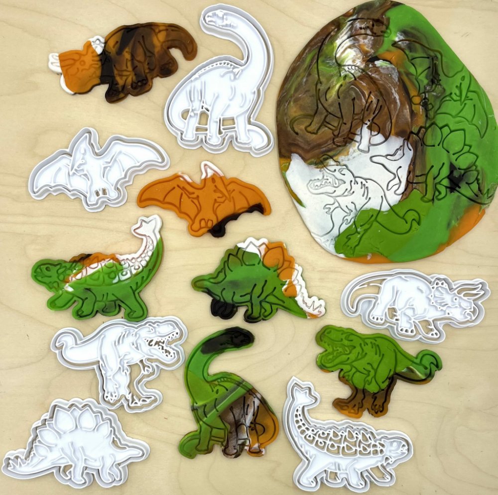 Sada obsahuje 6ks vykrajovátek- brontosaurus, stegosaurus, T-Rex, pterodaktyl, triceratops, ankylosaurus.