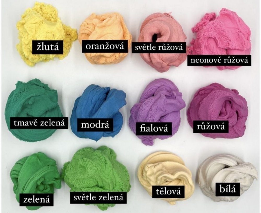 UPOZORNĚNÍ: Modrý a tmavě zelený kineťáček může barvit ruce, které lze snadno omýt mýdlem. Mohou obarvit také podložku, proto je vhodné nejdříve vyzkoušet, jak lze omýt. Máme zkušenost, že kovový tác jde dobře, plastový PlayTray je potřeba vzít speciálním čističem.