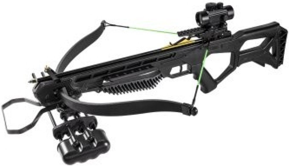 Zvratná kuše Man Kung MK-XB25BK Spectre 175lbs, 260fps Síla tahu: 175 LBS (s napínákem cca 88 LBS) Rychlost: 260 FPS - 79 m/s Mířená střelba až do vzdálenosti 65 metrů Hmotnost: 2631 gramů Délka: 81,3cm Šířka: 27,7cm Typ lišty: 20mm Picatinny Sklolaminátová ramena Vzletová lišta z hliníku Včetně zaměřovače s červeným bodem Včetně toulce Včetně napínací šňůry Dodávka obsahuje 4 hliníkové šípy 18“ M...