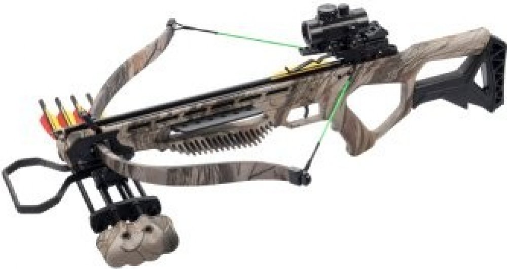 Zvratná kuše Man Kung MK-XB25GODC Spectre 175lbs, 260fps Síla tahu: 175 LBS (s napínákem cca 88 LBS) Rychlost: 260 FPS - 79 m/s Mířená střelba až do vzdálenosti 65 metrů Hmotnost: 2631 gramů Délka: 81,3cm Šířka: 27,7cm Typ lišty: 20mm Picatinny Sklolaminátová ramena Vzletová lišta z hliníku Včetně zaměřovače s červeným bodem Včetně toulce Včetně napínací šňůry Dodávka obsahuje 4 hliníkové šípy 18“...