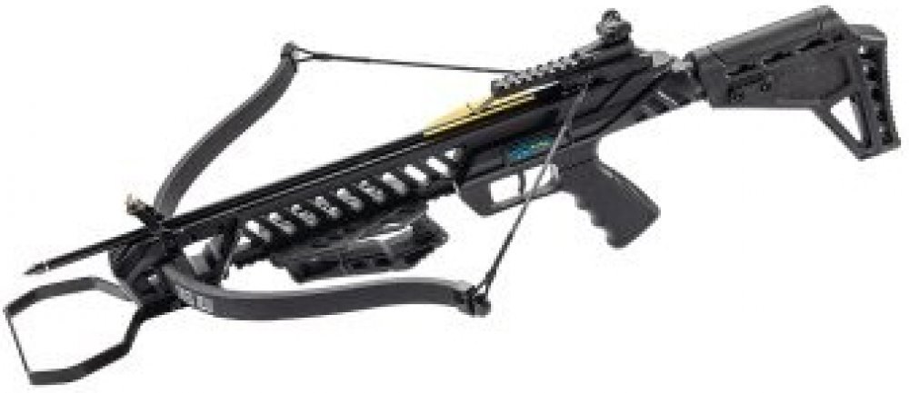Reflexní lovecká kuše Man Kung MK-XB27BK 175lbs, 255fps Další důležitou výhodou oproti těmto modelům je výbava lištou Picatinny pod vzletovou lištou. Můžete na něj namontovat dvojnožku, laser nebo světlo. Na této liště je namontována i přední rukojeť a lze ji tedy posouvat. Na horní liště je standardně nastavitelné hledí, ale můžete na něj namontovat i přiložený červený bod. Pažba je také nastavitelná. Součástí je napínací šňůra, která vám pomůže natáhnout kuši. Tento nástroj snižuje sílu tahu asi o polovinu. To usnadňuje napínání této kuše než modely řady MK-150, protože nemohou být natahovány napínacím lankem. Přiložený napínák a šípy z něj tvoří kompletní výbavu. V neposlední řadě je kuše vybavena automatickou pojistkou, aby se předešlo nehodám. Síla tahu: 175 LBS (s napínákem cca 88 LBS) Rychlost: 255 FPS - 78 m/s Mířená střelba až do vzdálenosti 60 metrů Hmotnost: 2368 gramů Délka: 78,0cm Šířka: 66,0cm Typ horní lišty: 20mm Picatinny Typ spodní lišty: 20mm Picatinny Sklolaminátová ramena Vzletová lišta z hliníku Včetně zaměřovače s červeným bodem Včetně napínací šňůry Dodávka obsahuje 2 hliníkové šípy 16“ Man Kung