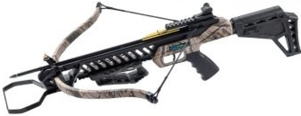 Zvratná lovecká kuše Man Kung MK-XB27GODC 175lbs, 255fps Další důležitou výhodou je přídavná 20mm Picatinny lišta na spodní straně kuše. Můžete na ni namontovat laser, světlo nebo dvojnožku. Přední madlo je také namontováno na této liště a je tedy nastavitelné. Pažba je také nastavitelná, takže délka kuše se může pohybovat mezi 78 a 82cm. Díky tomu je dobře nastavitelná pro jakoukoli polohu při střelbě. Pro bezpečnou a přesnou střelbu je model MK-XB27GODC vybaven automatickou pojistkou a nastavitelným mířidlem. Toto mířidlo můžete sejmout, načež můžete upevnit zaměřovač s červeným bodem. Vzhledem k vysoké síle tahu 175 LBS je zdarma přibalena napínací šňůra MK-CS. Tato kuše je dodávána také s tětivou a 2 šípy. Síla tahu: 175 LBS (s napínákem cca 88 LBS) Rychlost: 255 FPS - 78 m/s Mířená střelba až do vzdálenosti 60 metrů Hmotnost: 2368 gramů Délka: 78,0cm Šířka: 66,0cm Typ horní lišty: 20mm Picatinny Typ spodní lišty: 20mm Picatinny Sklolaminátová ramena Vzletová lišta z hliníku Včetně zaměřovače s červeným bodem Včetně napínací šňůry Dodávka obsahuje 2 hliníkové šípy 16“ Man Kung