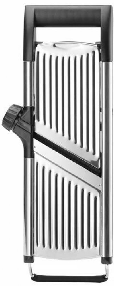 Čepele, řezná plocha (po které klouže zelenina) a tělo jsou vyrobeny z nerezové oceli.