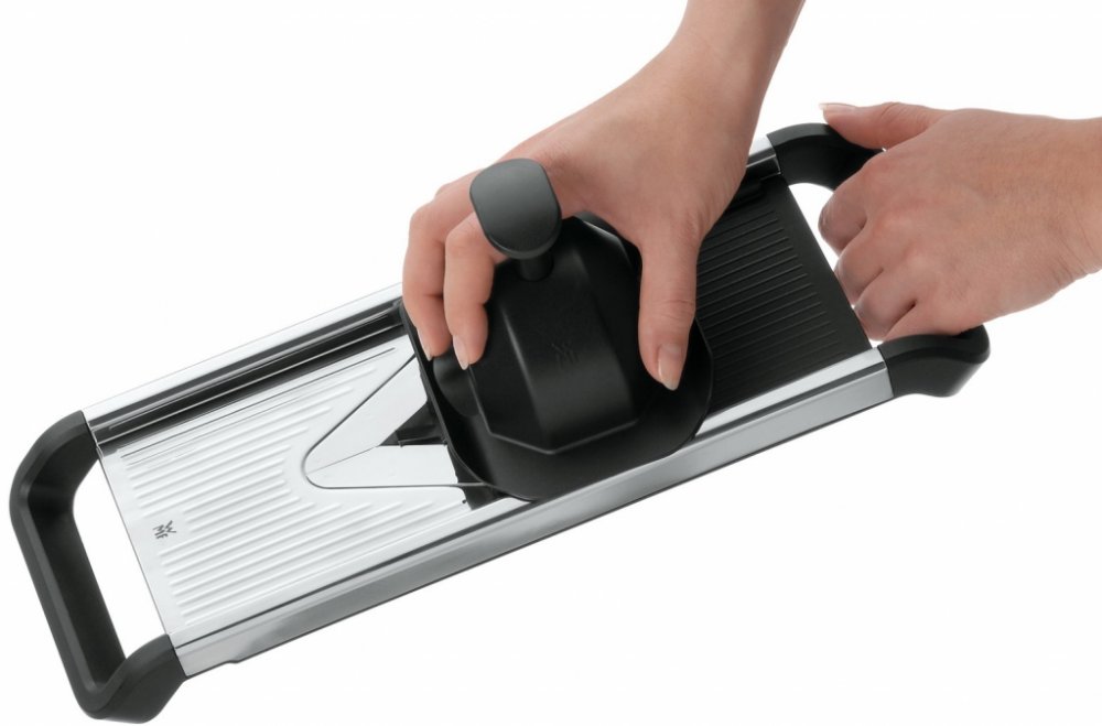 Mandolína na zeleninu Top Tools krouhá dokonale ovoce i zeleninu všeho druhu, včetně mrkve, ředkve nebo zelí. Provedení z nerezové oceli 18/10 je pevné a odolné. Na dotyk příjemné pastové držadlo sedí v ruce dobře a jistě, protiskluzové provedení rámu a spodní strany poskytuje spolehlivou oporu na pracovní ploše, v mísách, hrncích i na krájecích prkénkách. Tloušťku nastrouhaných plátků lze nastavit regulačním kolečkem na spodní straně struhadla od 0 do cca 8 mm. 16 cm dlouhá krouhací plocha umožňuje pohodlnou a efektivní práci. Všechny díly lze umývat v myčce na nádobí. Nástavce tvoří nudličky julienne o síle 3 a 7 mm.