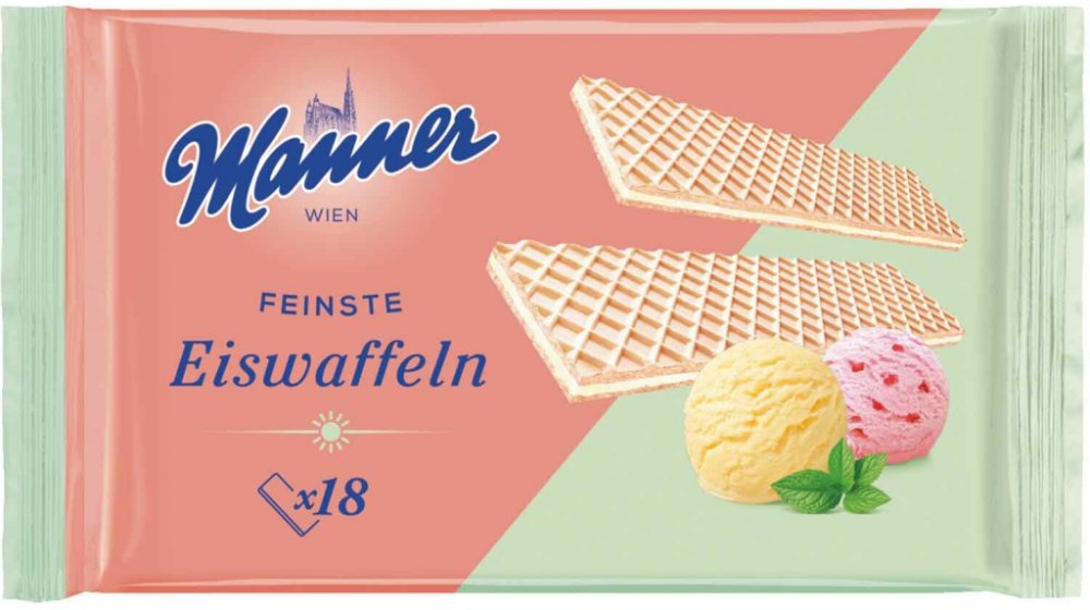 Charakteristická vanilková krémová náplň a karamelizovaný cukr ve zmrzlinových oplatkách značky Manner činí zmrzlinovou