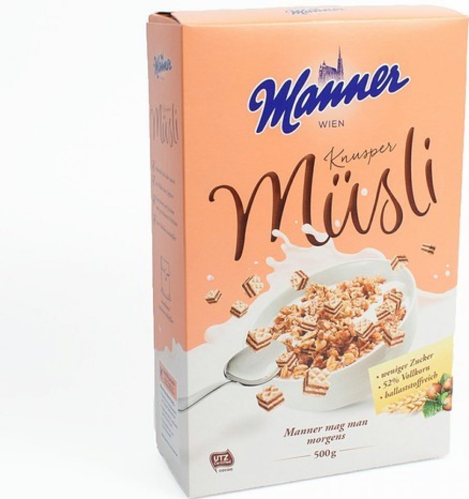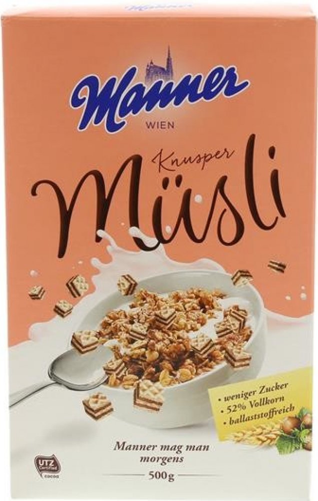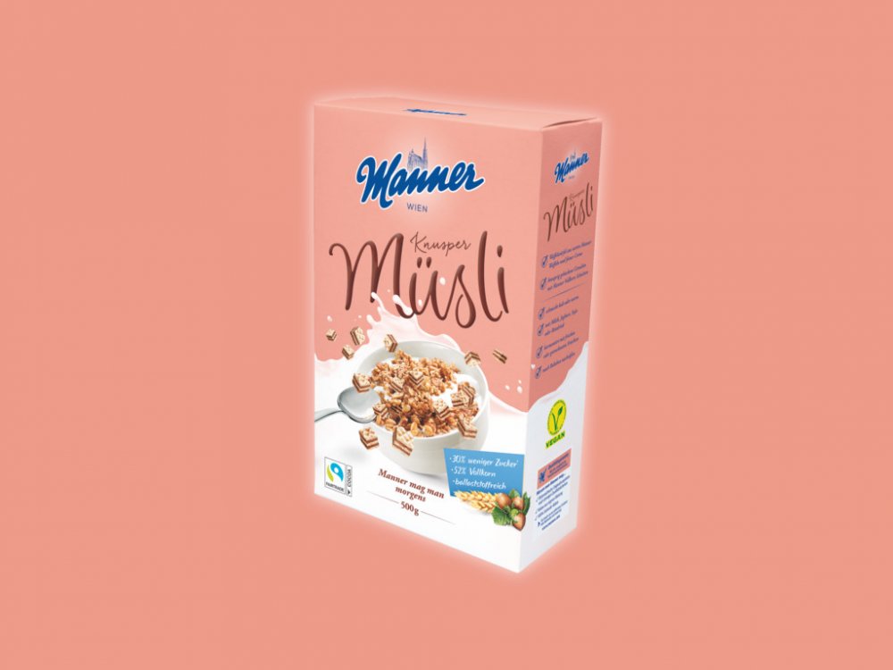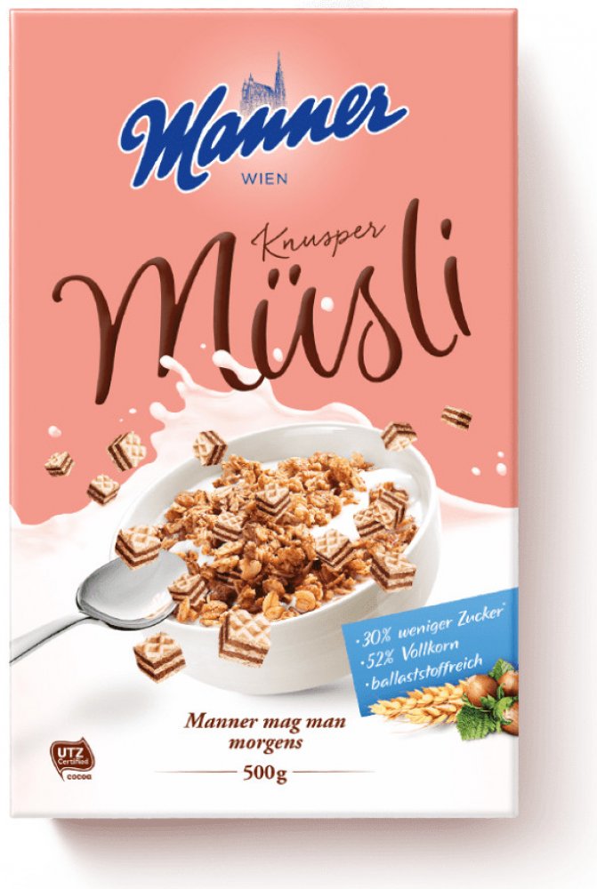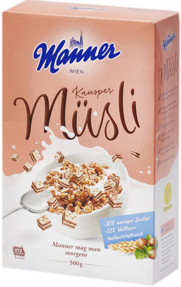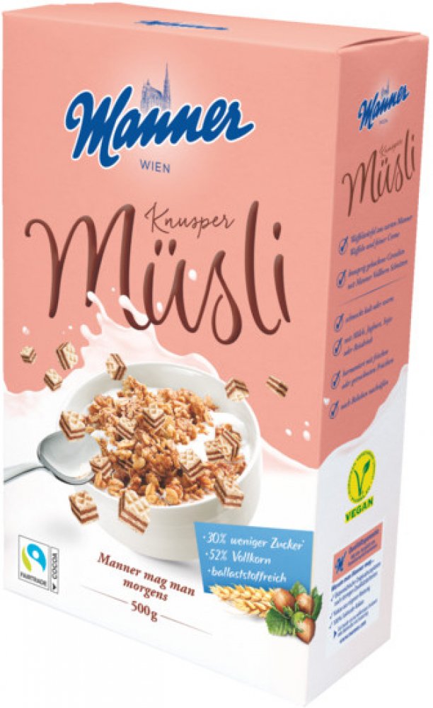 Křupavá snídaně s originálním Manner oplatky. Chutná nejen jako vynikající snídaně, ale je také ideální pro vyvážený start do nového dne. S podílem celozrnné složky je bohaté na vlákninu a tak poskytuje mnohem více růžové energie. Manner müsli má méně cukru, než konvenční produkty, neobsahuje žádné živočišné složky a proto je také ideální pro veganské snídaně.