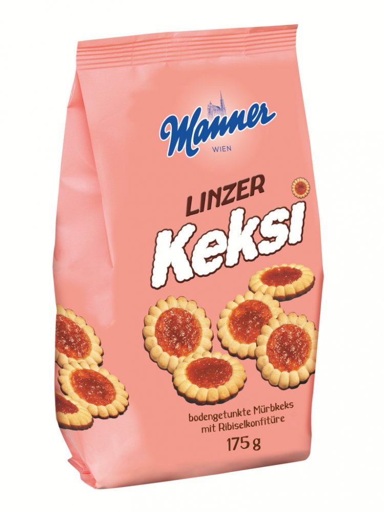Popis: Křehké sušenky plněné rybízovým džemem (14%) a polomáčené v čokoládě (21%). Linecké oplatky jsou vyrobeny z výborného křehkého těsta s náplní marmelády. Jako náplň se odedávna používá jemná, nakyslá rybízová marmeláda, která podle zásad záruky kvality produktů Manner neobsahuje žádná barviva ani aromatické látky.