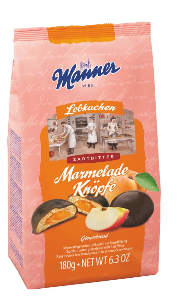 Manner Marmelade Knopfe 180g perníky s meruňkovo-jablečnou náplní (29%) máčené v čokoládě (29%)