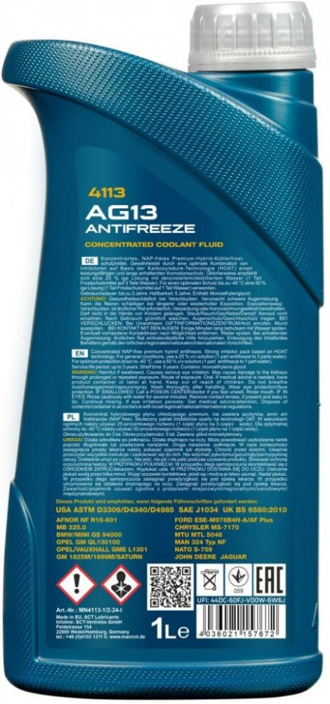 MN4113-1 Je univerzální koncentrát nemrznoucí kapaliny nejvyšší kvality na bázi etylenglykolu. Chrání proti korozi, zabraňuje tvorbě usazenin a pěnění, čímž zajišťuje optimální odvod tepla a brání přehřátí systémů. Optimální skladba inhibitorů umožňuje delší výměnné intervaly. Neobsahuje aminy, nitráty a fosfáty. Je vhodný pro použití v chladících systémech z hliníku, mědi, nebo slitiny. Nedoporučujeme míchat s jinými nemrznoucími kapalinami. SPECIFIKACE: SAE J1034, ASTM D3306/D4340/D4985, BMW, DAF, FORD AF Plus, FORD ESE-M978B4H-A, GM 1825M/1899M, GM SATURN, JAGUAR, JOHN DEERE, MAN 324, MB 235.0, NATO S-759, OPEL GM QL130100, PORSCHE, RENAULT Typ D, ROVER, SAAB, VW-Audi-Porsche