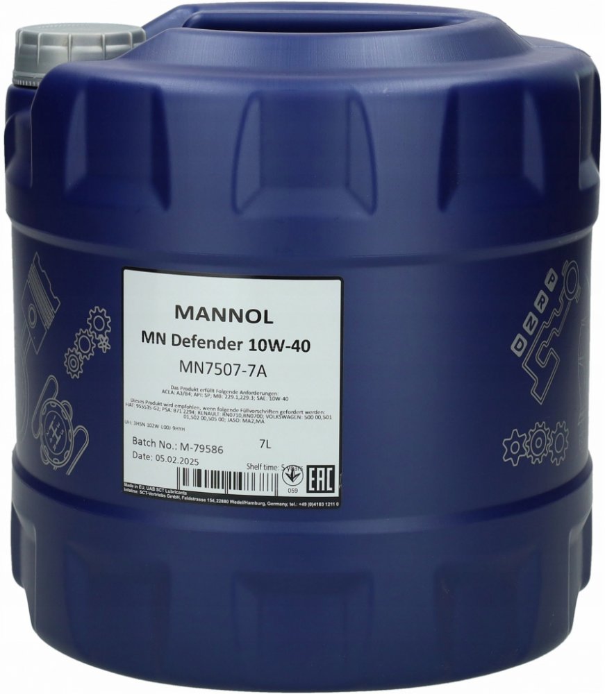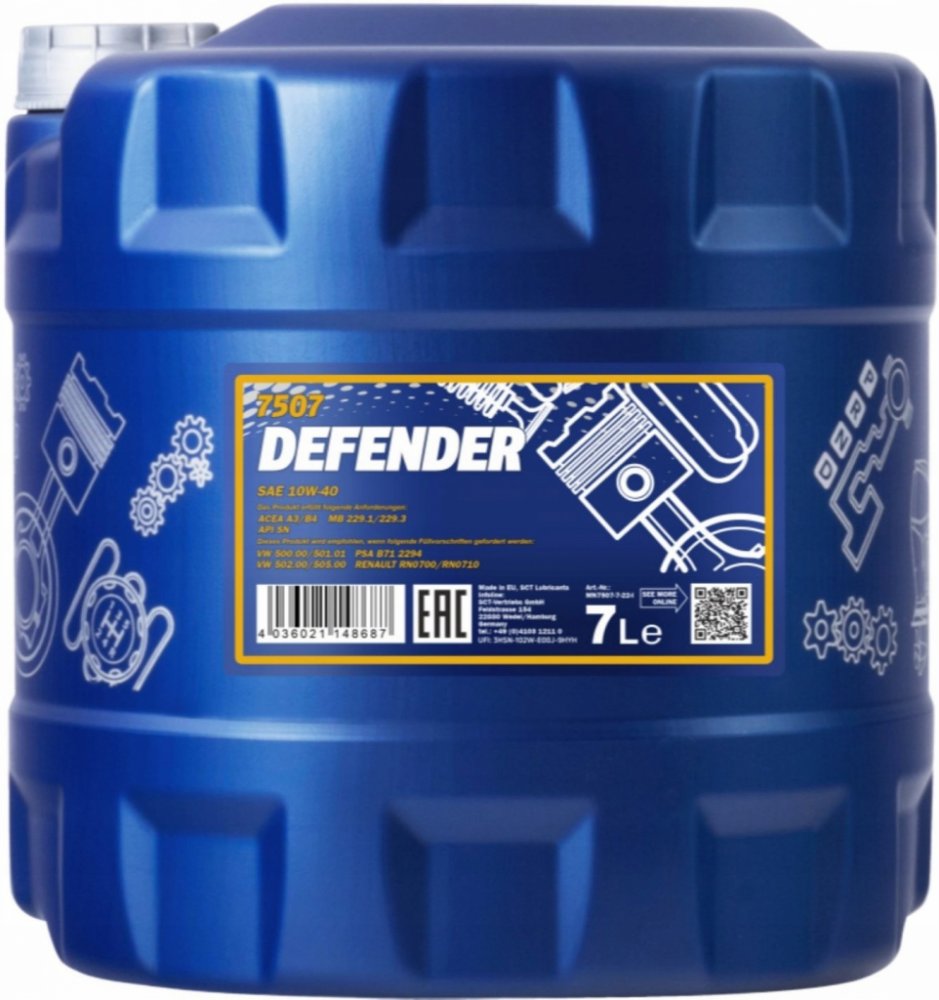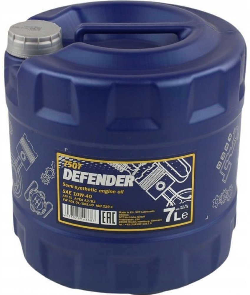 Informace o produktuMotorový olej Mannol Defender 10W-40 je vysoce kvalitní, syntetický motorový olej určený pro širokou škálu osobních a lehkých užitkových vozidel. Splňuje požadavky moderních motorů s přímým vstřikováním a turbodmychadlem. Tento olej je ideální pro motory pracující v náročných podmínkách, a to díky svému vynikajícímu mazacím účinku a ochraně proti opotřebení. Mannol Defender 10W-40 poskytuje výbornou ochranu proti korozi a tvorbě usazenin, čímž zajišťuje dlouhou životnost motoru a udržuje jeho optimální výkon. Speciální aditivní balíček zaručuje vynikající disperzní vlastnosti, které udržují motor čistý a zabraňují zanášení olejových kanálků. Olej je vhodný pro motory s katalyzátory a splňuje požadavky nejnovějších emisních norem. Díky svému univerzálnímu charakteru je Mannol Defender 10W-40 kompatibilní s různými typy motorů a provozních podmínek. Jeho použití přispívá ke snížení spotřeby paliva a prodlužuje interval výměny oleje. Vhodný pro motory s náročnými intervaly výměny oleje, dle specifikace výrobce vozidla. Je kompatibilní s běžnými náhradními díly a těsněními. Použití tohoto motorového oleje přináší zásadní benefit v podobě snížené opotřebitelnosti motoru, lepšího chodu a delší životnosti. Olej splňuje normy API SN/CF, ACEA A3/B3 a je vhodný pro vozidla dle specifikací výrobce. Zajišťuje vynikající ochranu proti opotřebení, korozi a tvorbě usazenin, přičemž udržuje motor v optimální kondici. Díky své kvalitě a výkonnosti se Mannol Defender 10W-40 stává ideální volbou pro náročné uživatele.Technické specifikaceTyp oleje: SyntetickýViskozita: 10W-40Objem: 7 litrůKatalogové číslo: 7507-7Normy: API SN/CF, ACEA A3/B3Určení: Osobní a lehká užitková vozidlaVhodnost: Motory s přímým vstřikováním a turbodmychadlemVýrobce: MANNOLVlastnosti a výhodySyntetická formulace: Zajišťuje vynikající mazání a ochranu proti opotřebení.Viskozita 10W-40: Vhodná pro široké teplotní rozmezí provozu.Aditivní balíček: Udržuje motor čistý a zabraňuje tvorbě usazenin.Ochrana proti korozi: Prodlužuje životnost motoru a chrání před poškozením.Kompatibilita s katalyzátory: Respektuje emisní normy.Dlouhá životnost: Umožňuje prodloužené intervaly výměny oleje.Poznámky k instalaciMotorový olej Mannol Defender 10W-40 se instaluje standardním postupem výměny motorového oleje. Ujistěte se, že motor je vlažný, ale ne horký. Otevřete vypouštěcí šroub a nechte starý olej vytéct do nádoby určené k recyklaci. Vyměňte filtr motorového oleje. Na čistý vypouštěcí šroub nasaďte novou podložku (pokud je to doporučeno výrobcem). Vypouštěcí šroub utáhněte správným momentem. Nalijte nový olej do motoru do správné hladiny. Kontrolujte hladinu oleje pravidelně během prvních kilometrů a případně doplňte. Důležité: Dodržujte doporučení výrobce vozidla ohledně specifikace a intervalu výměny oleje..