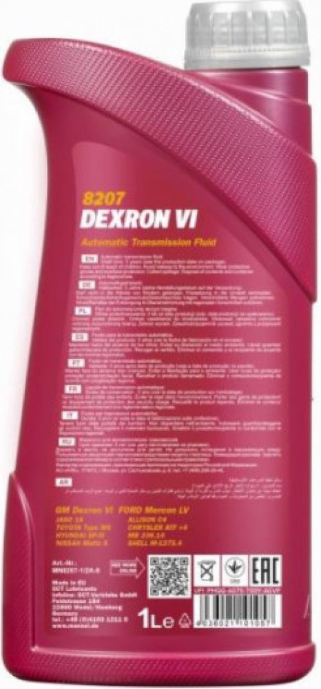 Mannol Dexron VI, 1LUniverzální celoroční syntetická převodová kapalina (ATF) pro automatické převodovky, hydraulické měniče, hydraulické posilovače řízení, auto hydraulické spojky a jiná hydraulická zařízení, včetně těch, které pracují v těžkých podmínkách v nákladních a terénních vozidlech. Zajišťuje bezchybnost provozu automatické převodovky, zaručuje minimální opotřebení, trvalý servis životnost převodovek a spotřeba paliva. Byl vyvinut na základě požadavků stanovených skupinami GM a Ford.Vlastnosti:- Nejkvalitnější nízkoviskózní syntetická báze s konzistentně vysoký viskozitní index v kombinaci s multifunkčním balíčkem aditiv zachovává všechny své vlastnosti v širokém rozsahu teplot: zajišťuje dobré mazací vlastnosti při nízkých (-45°C a nižších) teplotách v zimě a zajišťuje stabilní olejový film při extrémním zatížení a vysokých teplotách v létě; - Vysoce technologická kombinace přísad zajišťuje vynikající třecí vlastnosti pro ozubené spojky a vynikající třecí vlastnosti pro třecí prvky zajišťující významnou úsporu paliva, kontinuální, přesné a plynulé řazení převodovky za jakýchkoliv jízdních podmínek a prodloužená životnost samotné automatické převodovky a všech prvků převodovky. Zajišťuje a koordinovaný a hladký chod spojek. Zabraňuje oděru; - Má výjimečnou tepelně-oxidační a chemickou stabilitu a odolnost k vysokoteplotní tepelné degradaci po celou dobu životnosti. Umožňuje snížit lakování, tvorbu kalů, sazí a jiného uhlíku usazeniny, prodlužuje dobu mezi výměnami oleje a zajišťuje životnost převodových komponentů, čímž se snižují náklady na údržbu zařízení; - Účinně chrání kovové části před železnými a neželeznými slitinami (zejména radiátory) před korozí, když jsou v provozu i mimo něj; - Skvělá kompatibilita s materiály třecích spojek; - Účinně odolává provzdušňování a tvorbě pěny; - Zajišťuje vynikající kompatibilitu se všemi těsnícími materiály, zabraňuje jim před bobtnáním, tvrdnutím a smršťováním, což umožňuje snížit náklady na náhradní díly a zabraňuje únikům. Účinně chrání fluoroelastomerová těsnění; - Snižuje hlukDoporučuje se pro automatické převodovky osobních automobilů vyžadujících ATF typ Dexron-VI nebo Dexron-III H/G/F nebo Dexron-III E nebo FORD MERCON LV kvalitní olej. Doporučuje se pro použití v nových 6-stupňových převodovkách GM, Vozidla BMW, Land Rover, Jaguar a také 8- a 10-stupňové převodovky vozidel Aisin.
