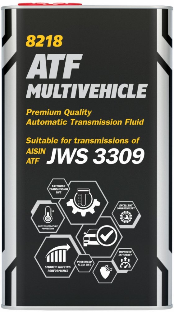 Je univerzální olej pro automatické převodovky mnohých osobních a lehkých užitkových vozidel vč. nejmodernějších automatických převodovek od asijských výrobců. Vylepšené charakteristiky tření zajišťují plynulé řazení a vynikající komfort řazení při nízkých teplotách. SPECIFIKACE: AISIN WARNER JWS 3309, JASO M315 Type 1A, JATCO ATF/3100 PL085, TOYOTA ATF Type T/T-II, TOYOTA ATF TypeT-III/T-IV, NISSAN/INFIN. MATIC D/J/K, NISSAN/TEXACO N402 (FWD), MITSUBISHI D.SP-II/SP-III, MAZDA ATF-M III / ATF-MV, DAIHATSU ALUMIX ATF MULTI, HONDA ATF-Z1 (not CVT), HONDA ATF DW-1, SUZUKI 3314/3317/2384K, SUZUKI ATF OIL /SPECIAL, SUBARU ATF / ATF-HP, HYUNDAI/KIA SP-II/SP-III, IDEM.K17-Jag. X T. 2001-5, MOPAR AS68RC, GM DEXRON IID/IIE/IIIF, DEXRON IIIG/IIIH, CHRYSLER ATF +3/+4, VW/AUDI G 052 025-A2, VW/AUDI G 052 162-A1, VW/AUDI G 052 990-A1/A2, VW/AUDI G 055 025-A1/A2, BMW 7045E (3 Series), BMW ETL-8072B (5 Series), BMW LA2634 / LT71141 ZF-5, MB 236.1/.2/.3/.5/.6, MB 236.7/.9/.10/.11, PORSCHE JWS 3309, VOLVO 97340 / 97341, VOITH 55.6335.XX (G607), ALLISON C-4, ZF TE-ML 03D/04D/11B/14A, ZF TE-ML 14B/16L/17, FORD MERCON V; FNR5, MAN 339F/V1/V2/Z1/Z2