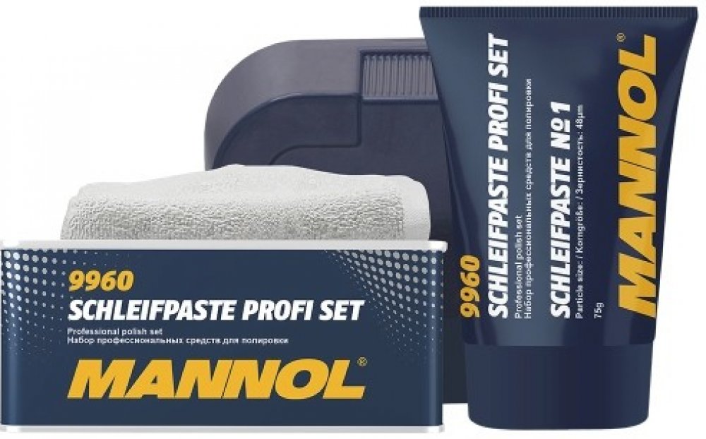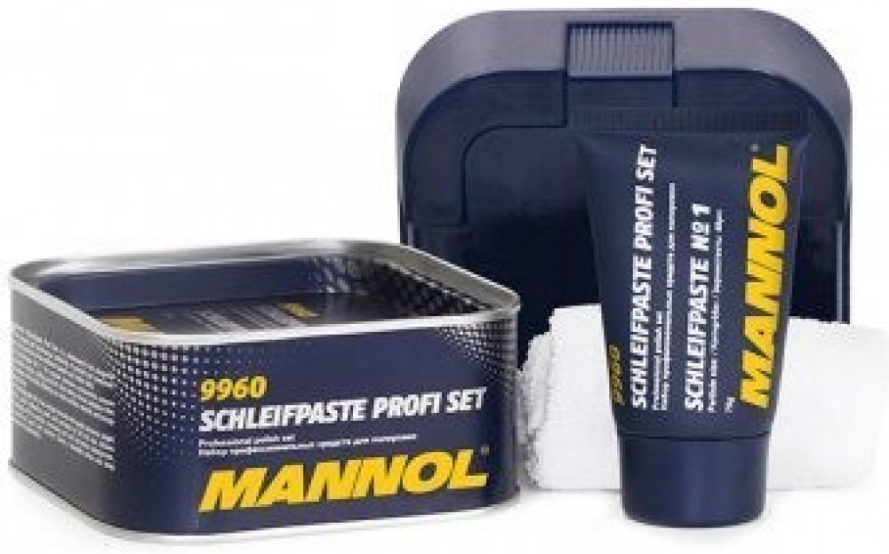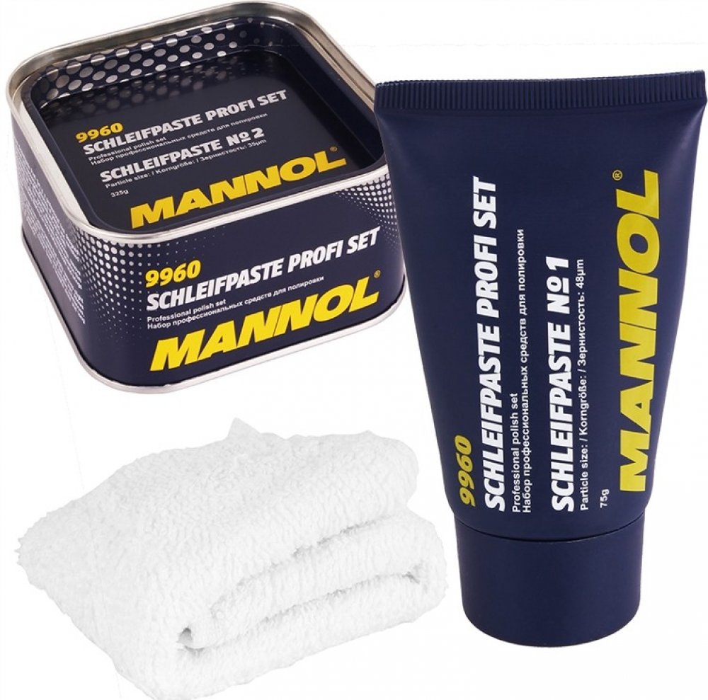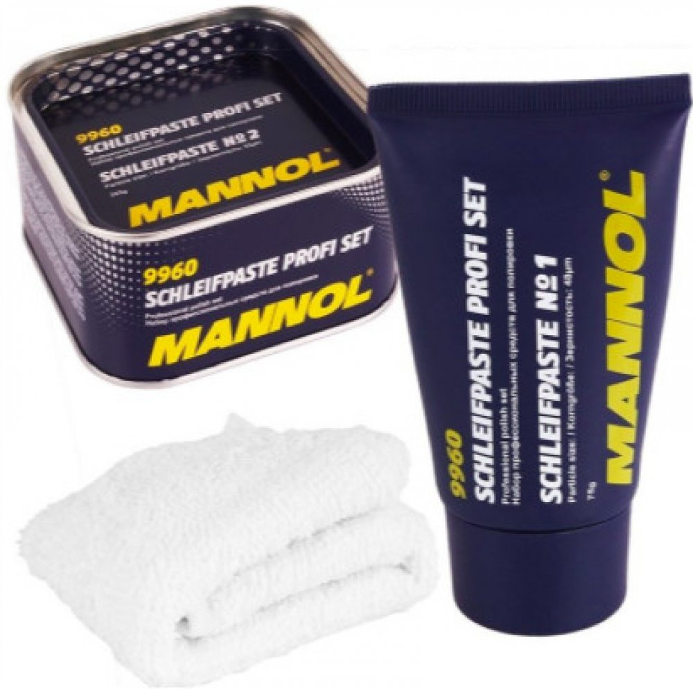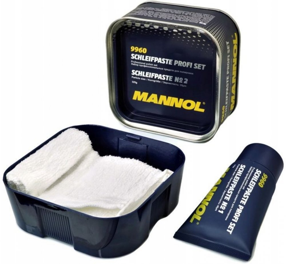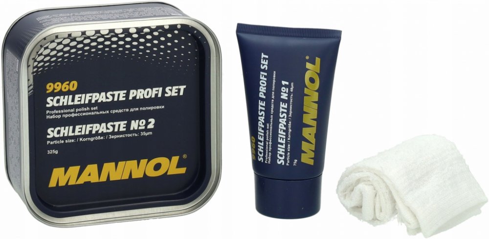 MANNOL 9960 SCHLEIFPASTE PROFI SET - Mannol Schleifpaste Profi Set - je profesionální produkt určený na ruční a mechanické leštění lakovaných povrchů. Sada se skládá ze dvou různých past a bavlněné látky. Mannol Schleifpaste č.1 Speciální brusné složky odstraňují hluboké škrábance, skvrny, rýhy a nečistoty. Také snadno odstraňuje oxidační film na povrchu těla. Hladký povrch karoserie způsobí, že vozidlu vrátí původní hlubokou barvu. Mannol Schleifpaste č. 2 má jedinečný recept, který snadno odstraní mírně škrábance, drobné chyby na laku a zbytky starého vosku. Umožňuje hloubkové čištění povrchu, odstraňuje rez a korozivní látky, mikrotrhliny na barvě a chromu. Poskytuje krásný lesk a dlouhotrvající úroveň ochrany.