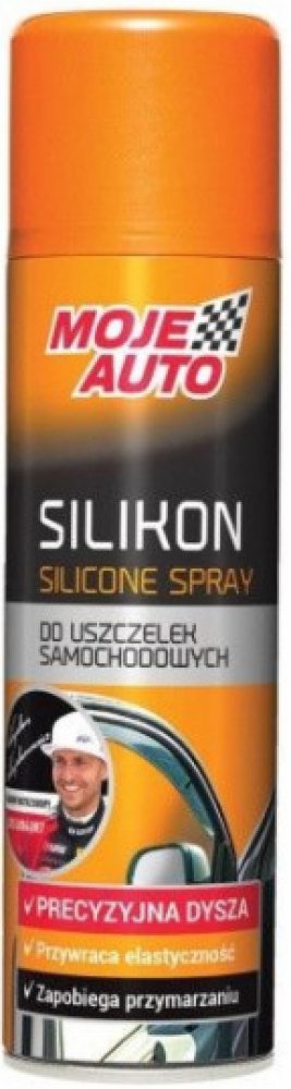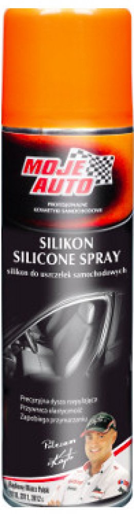 Silikonový sprej je univerzální ochranný voděodolný, izolační a protitřecí prostředek na bázi organokřemičitých sloučenin. Navrženo mimo jiné k účinnému mazání třecích ploch z různých materiálů (například kovu a plastu) k odstranění zadrhávání, skřípání a praskání, ke kterému dochází při provozu vozidla. Doporučeno pro použití tam, kde je nežádoucí použití maziv obsahujících ropné produkty a tuky. Vlastnosti: - Na ošetřeném povrchu vytváří souvislou průhlednou polymerní vrstvu molekul silikonu, která dodává povrchu vynikající vodoodpudivé a antistatické vlastnosti, navíc snižuje tření, zabraňuje vrzání, zamrzání a korozi; - Lze použít uvnitř i vně vozu, na povrchy z plastu, gumy, kovu, dřeva atd. - Chrání povrchy a obnovuje jejich lesk, chrání před vystavením ultrafialovému záření; - Obnovuje elasticitu pryžových a plastových dílů a chrání je před vysycháním a praskáním; - Neobsahuje minerální oleje a tuky. - Doporučeno pro mazání válečků a vodítek bezpečnostních pásů a poklopů, k ochraně pryžových těsnění dveří, kapot, vík kufru atd. před zamrznutím. Chrání nárazníky, mřížky, spoilery, lišty, vinylové krytky atd. před stárnutím a zkřehnutím. Chrání elektrická zařízení a kontakty před vlhkostí a vodou. Aplikace: Před použitím očistěte povrch, který má být ošetřen. Před použitím nádobu dobře protřepejte. Nastříkejte rovnoměrně na povrch v požadovaném množství ze vzdálenosti 10-15 cm, v případě potřeby povrch otřete suchým hadříkem. Nepoužívejte na předměty, které přicházejí do styku s potravinami. Přípravek můžete nanést na suchou houbu nebo hadřík a povrch důkladně otřít. Vyhněte se aplikaci na skleněné, lakované nebo látkové povrchy. Nepoužívejte na volant, pedály nebo kliky dveří.