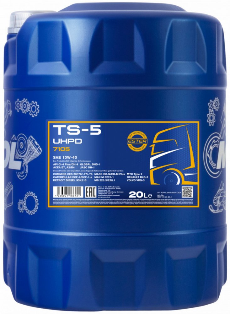 Mannol TS-5 UHPD 10W-40 7105 je inovativní celoroční polosyntetický motorový olej, navržený pro moderní těžce zatížené a vysokorychlostní dieselové motory s i bez turbodmychadla, pracující v extrémních podmínkách. Tento olej splňuje globální specifikaci GLOBAL-DHD-1, která zohledňuje požadavky evropských, amerických a japonských výrobců na těžké dieselové motory vyrobené po roce 1998. Díky kombinaci esterových komponentů a vysoce kvalitní polosyntetické báze poskytuje vynikající ochranu proti opotřebení, tření a korozi, což prodlužuje životnost motoru a zajišťuje úsporu paliva. Je navržen tak, aby splňoval požadavky na prodloužené intervaly výměny oleje.