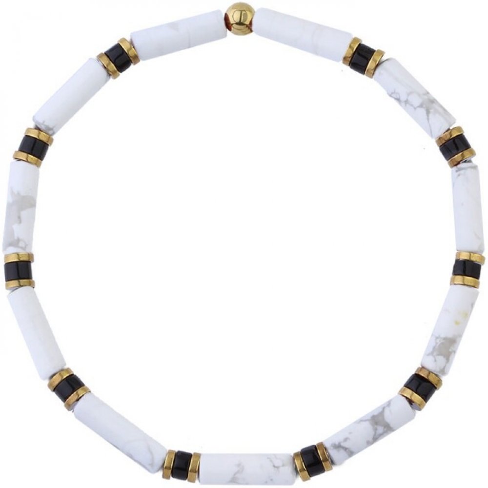 Tento pánský náramek spojuje tři výrazné minerály – bílý howlit, černý onyx a zlatý hematit – do harmonického celku, který vyzařuje klid, sílu a noblesu. Barevná kombinace bílé, černé a zlaté je nadčasová, elegantní a mimořádně stylová. Výsledný vzhled působí vyváženě a přitom mužně.Bílý howlit symbolizuje vnitřní rovnováhu a klid, černý onyx dodává sebedůvěru a stabilitu a zlatý hematit podtrhuje...