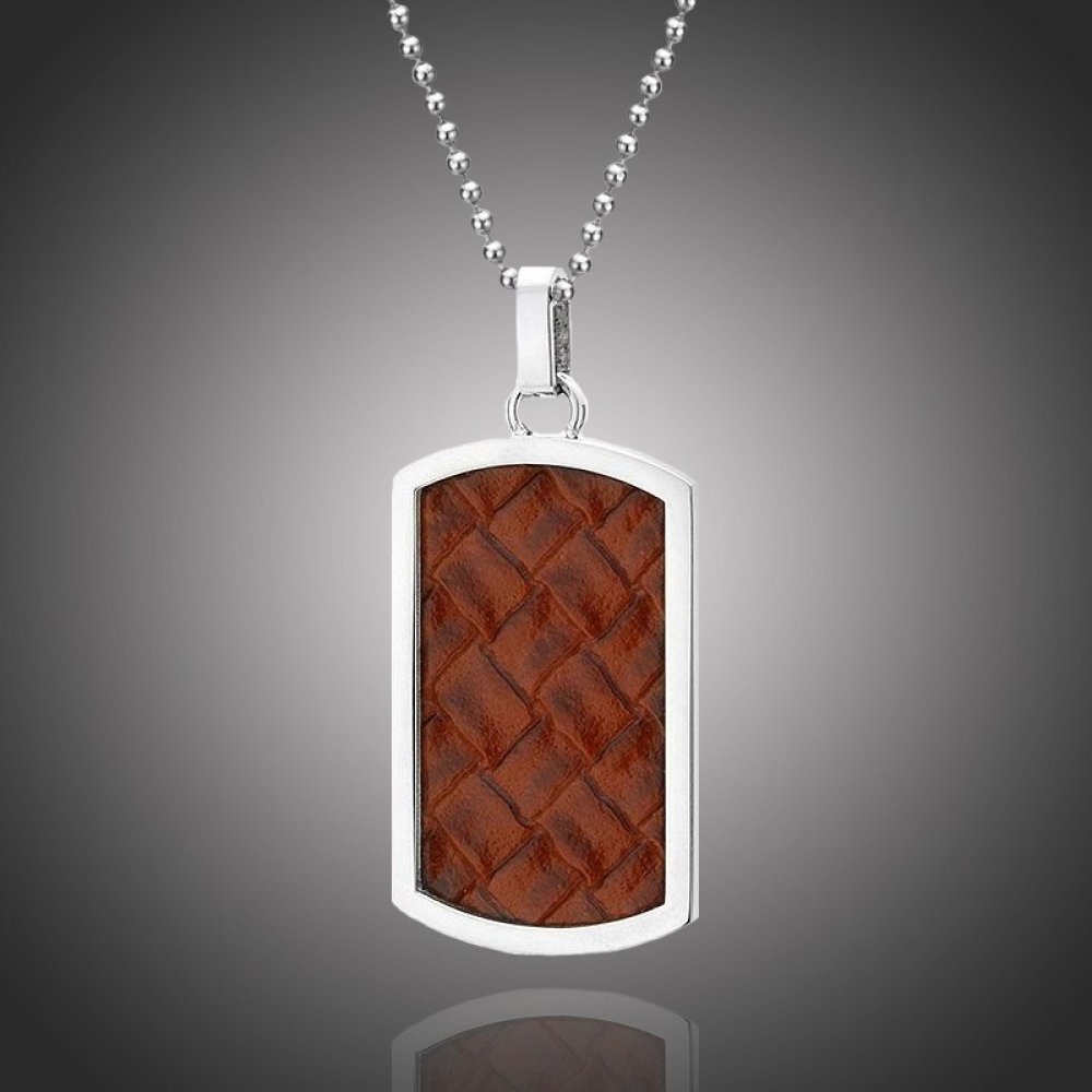 Moderní pánský náhrdelník, zhotovený z kombinace chirurgické oceli a přírodní kůže, je ideálním dárkem pro nejednoho muže. Tvoří ho jednoduchý delší ocelový řetízek a přívěsek ve tvaru vojenské známky, jehož rámeček je zhotoven z chirurgické oceli. Uvnitř se nachází výplň z hnědé přírodní kůže.