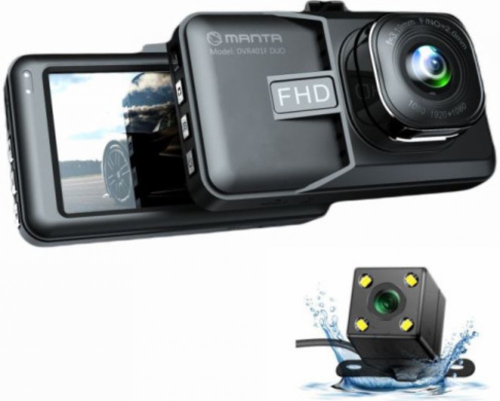 MANTA DVR401F DUO Black Eye, FHD Kamera do auta - Dodatočná VGA nahrávacia zadná kamera (Počas nahrávania sa na karte vytvoria dva samostatné súbory, jeden z prednej kamery, druhý zo zadnej kamery), FHD (1920x1080) hlavná kamera pri 30 fps, Materiálne dôkazy v prípade kolízie (záznam z nehody), Video v slučke, G-senzor, ochrana nahrávok pred vymazaním, Pozorovací uhol: 140°, Displej: 3" IPS, Batéria: 200 mAh, Napájanie: Auto 12V/5V - mini USB, slot na pamäťovú kartu (max. 64GB, Class 10), mini HDMI, menu v Slovenskom jazyku