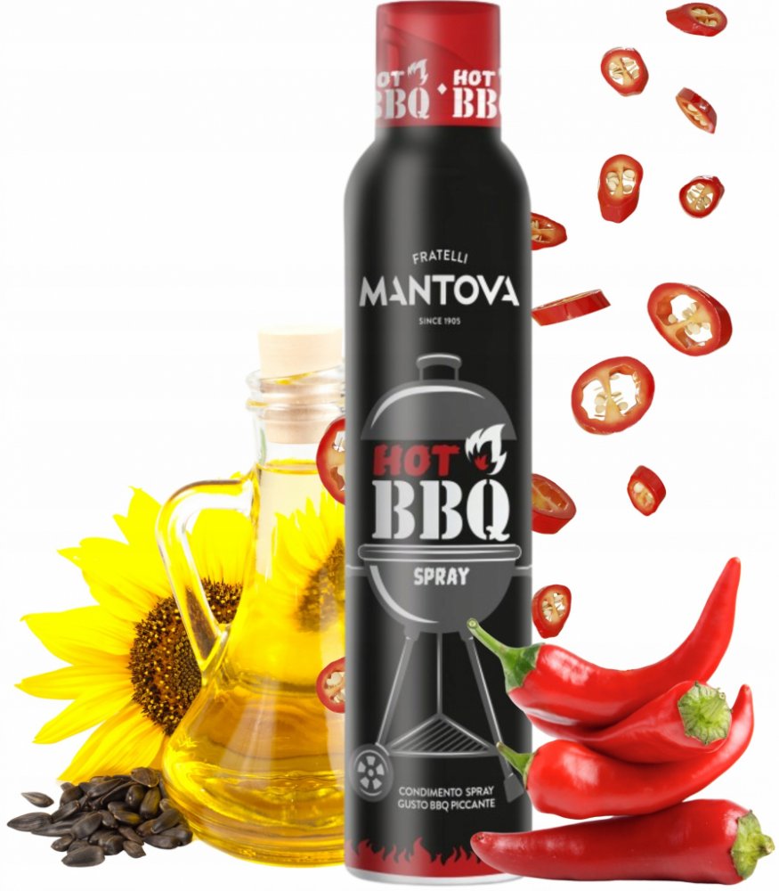 - FRATELLI MANTOVA Slunečnicový olej HOT BBQ ve spreji 200 ml je aromatická kompozice slunečnicového oleje s přírodním kořením BBQ a nádechem ostrosti. Tento sprej, vytvořený speciálně pro fanoušky grilovaného masa, burgerů a kuchyně s charakterem, dokonale zdůrazňuje chuť pokrmů a dodává jim intenzivní, kouřově-pikantní vůni.