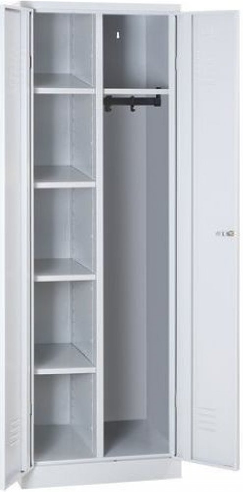 Úklidová uzamykatelná skříň ze svařovaného ocelového plechu. Větrací otvory v horní a dolní částí dvířek. Skříň je dělená na dva oddíly, z nichž jeden je se čtyřmi policemi, druhý obsahuje jednu vrchní polici a tyč s odkládacími háčky. Dvířka jsou zavěšená na vnitřních pantech. Možnost umístění štítku se jménem v horní části dveří.