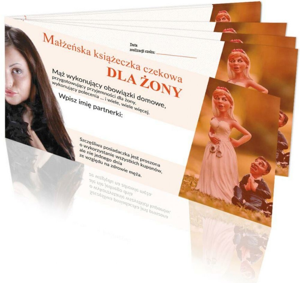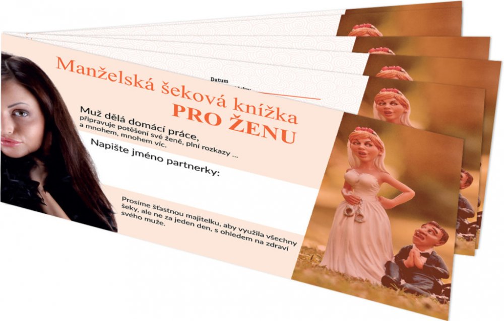 „Manželská šeková knížka pro ženu“ je dárek, který obohatí život každé ženy. V šekové knížce je spousta příjemných věcí a úkolů, které přispívají ke štěstí ženy. Muž přebírá roli mužského „vykonavatele“, čímž vyjadřuje lásku, kterou cítí ke své ženě a splní jí vše na co si vzpomene. Manželská šeková knížka pro ŽENU umožňuje vztahu dosáhnout další úrovně, kde manželé dokonale rozumějí jejich potřeb...