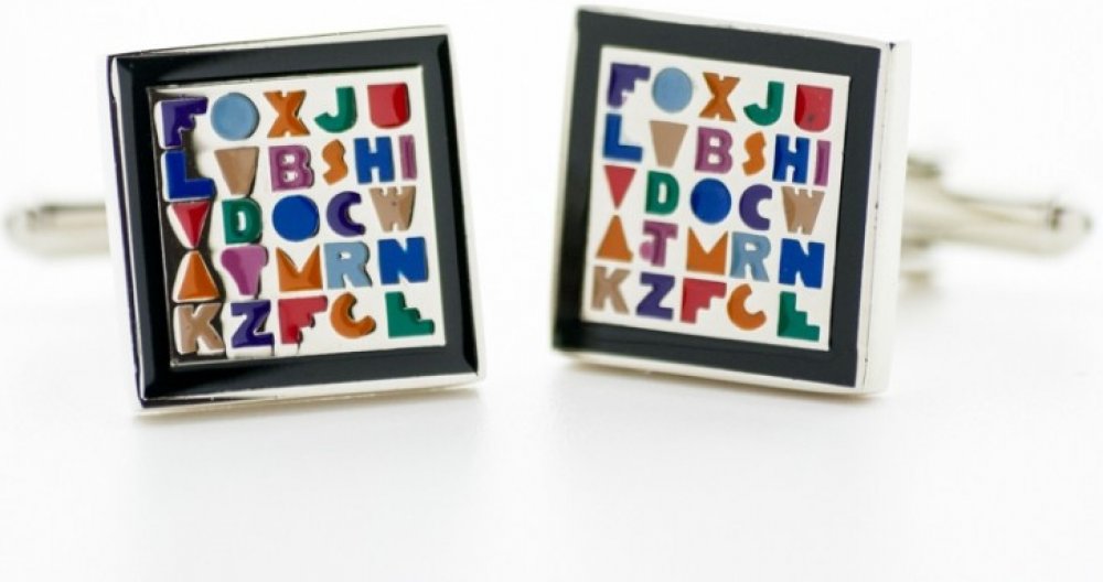 Manžetové knoflíčky čtvercového tvaru s černým lemováním. Po ploše manžetových knoflíčků jsou v pravidelných řádcích barevná písmena a symboly.