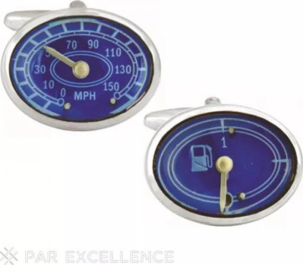 Exkluzivní manžetové knoflíky v designu tachometru a ukazatele stavu nádrže, barva stříbrná s modrou. Povrch je rhodiovaný s garancí 2 roky. Vyrobeno v Anglii.