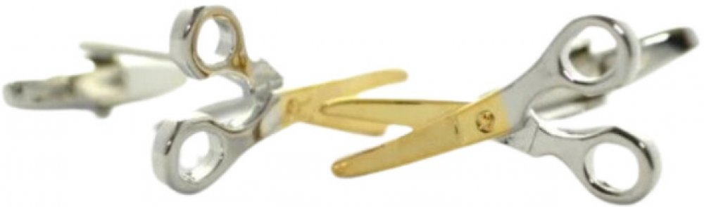 Manžetové knoflíčky ve tvaru nůžek v stříbrno-zlatém provedení.