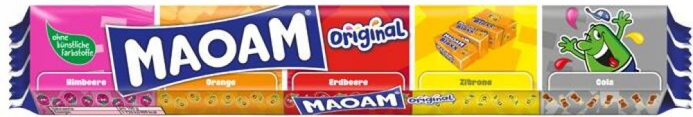 Haribo MAOAM tyčinka s balíčky jednotlivě balených žvýkacích ovocných bonbonů v 5 příchutích: Cola; jahoda; malina; višeň; pomeranč; citrón. Děti si je zamilují.
