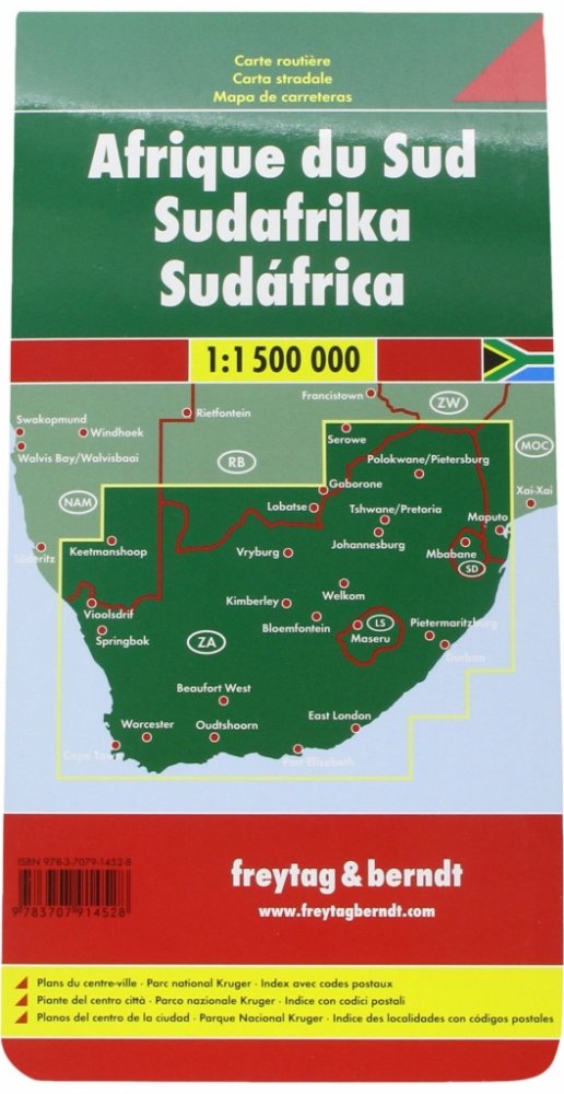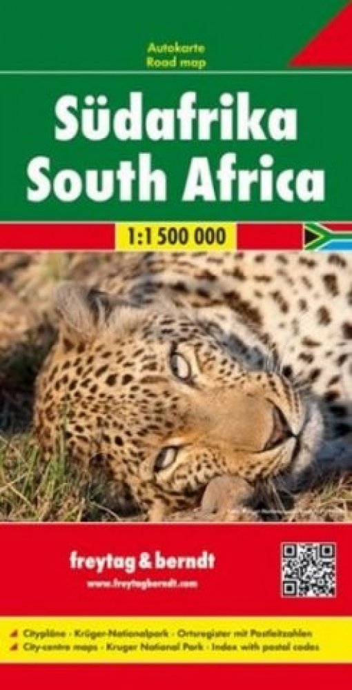 Jednostranná automapa Jižní Afriky (dříve JAR). Základem motoristického obsahu je podrobná silniční síť s kilometráží, čísly silnic. Zaznačeny jsou přírodní a kulturní zajímavosti, úseky s panoramatickým výhledem, pamětihodnosti, památky UNESCO. Ve výřezech plány měst Kapské město a Johannesburg. Na rubové straně mapa Krugerova národního parku v měřítku 1:400 000, mapa okolí Kapskho města v měřítk...