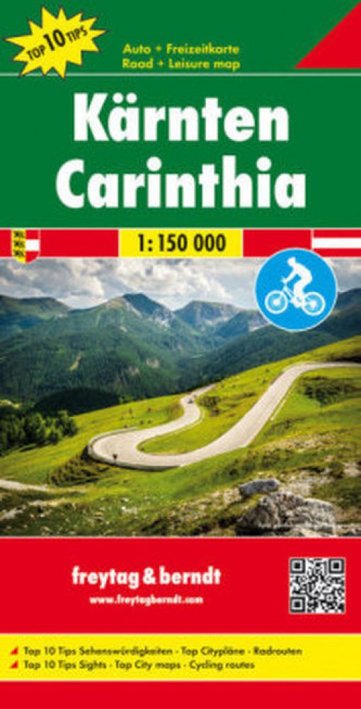 Jednostranná regionální automapa Korutan. Mapa s bohatým turistickým obsahem je svým měřítkem vhodná pro poznávání regionu autem či na kole (cyklotrasy). Silniční síť je označena čísly komunikací, zvýrazněny placené úseky silnic, symbolické znaky pro benzínové stanice, odpočívadla, motely, kilometráž, uzavřené úseky. Vedle dopravních informací jsou zaznačeny přírodní rezervace, panoramatické cesty...