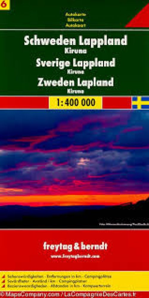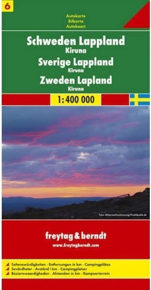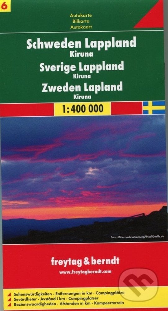 Publikace: Schweden Lappland-Kiruna/Švédsko-Laponsko,Kiruna 1:400T/automapa - neuveden. Automapa v měřítku 1 : 400 000 (1 cm = 4 kilometry) zobrazuje síť silnic a dálnic s dopravními vzdálenostmi, dále všechna sídla a vybraný tematický obsah (hrady, zámky, kláštery, kempy apod.). Součástí mapového podkladu jsou lesy a stínovaný terén. Rejstřík sídel je vlepen v samostatném sešitě. Publikace: Schwe...
