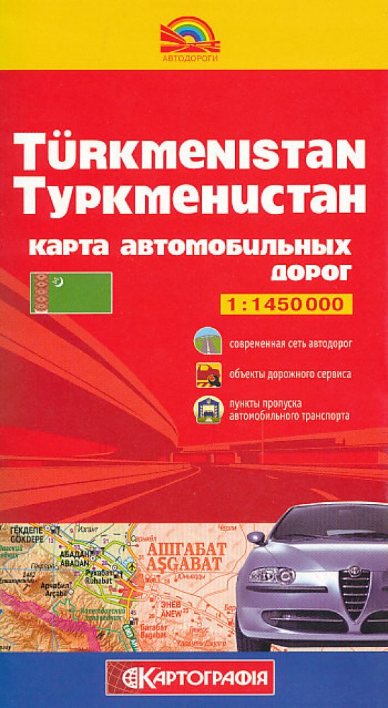 Jednostranná mapa Turkmenistánu v měřítku 1:1 450 000. Výškopis vyjádřen pomocí stínování, barevné hypsometrie a výškových kót. Dále zobrazena sídla, vodopis. Do tohoto podkladu zakreslena silniční síť, která je doplněna kilometráží, vyznačením čerpacích stanic, autoopraven a hraničních přechodů. Zakreslena též síť železniční a hranice země a administrativních celků. Popis mapy azbukou, u větších sídel i latinkou. Legenda a vzdálenostní tabulka na okraji mapy. Vydání 2013.