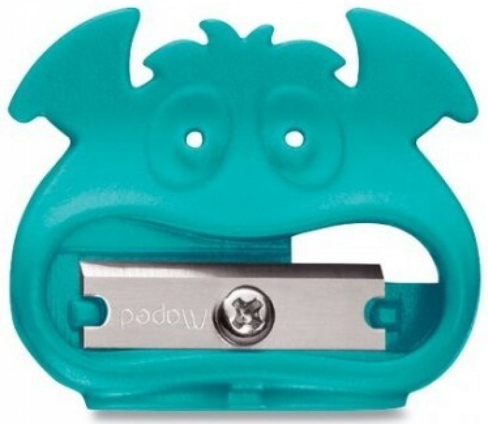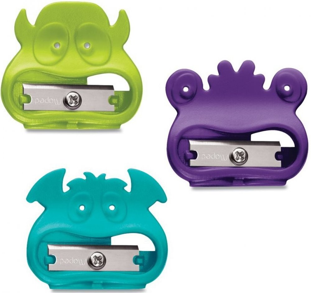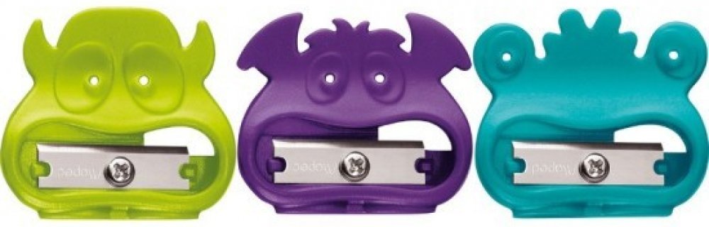 Plastové ořezávátko bez odpadní nádobky s 1 otvorem. 5 různých motivů monster od barvy. Mix barev.