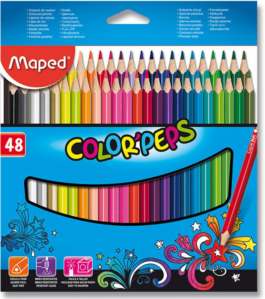 Ergonomické pastelky Maped Color´Peps mají trojhranné tělo, měkkou odolnou tuhu a pestrou jasnou stopu Pastelky jsou prodávány v papírové krabičce. Pastelky se bez problému vejdou do penálu. Využijete nejen ve škole, ale i doma. Stačí jen zapojit svou kreativitu a zkusit vybarvit některé z omalovánek. Pastelky jsou slabé (běžná tloušťka jako je tomu například u grafitových tužek) a můžete je bez problému ořezávat.