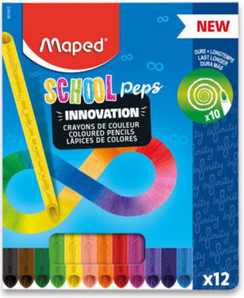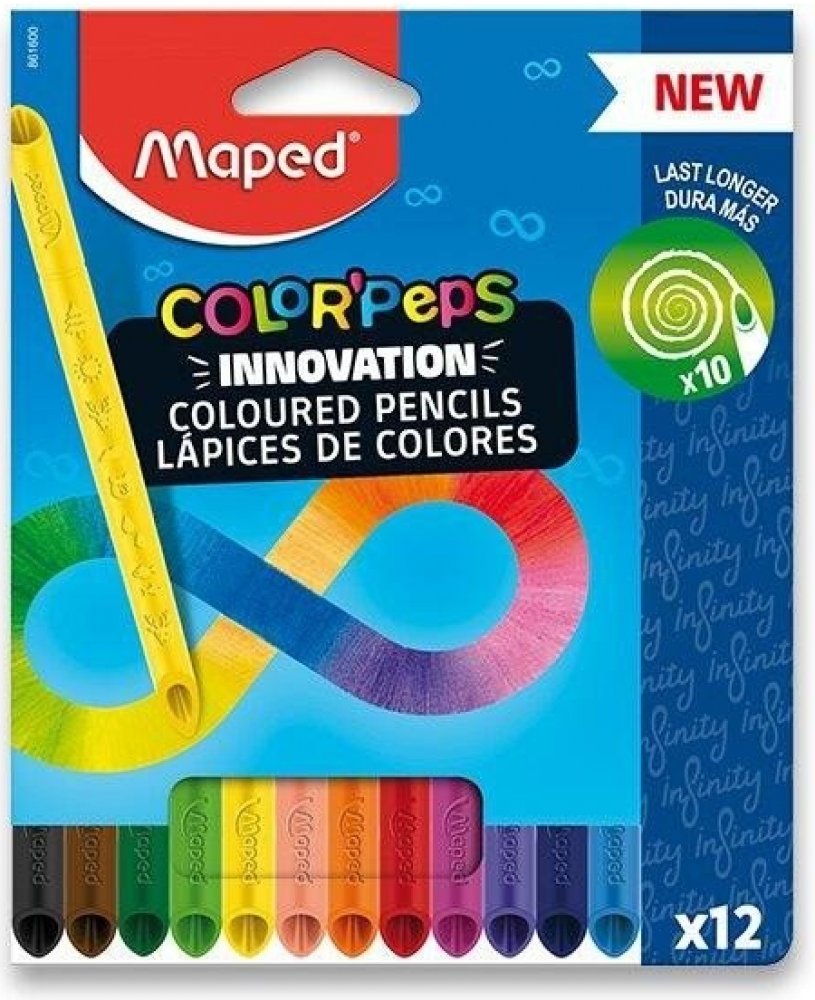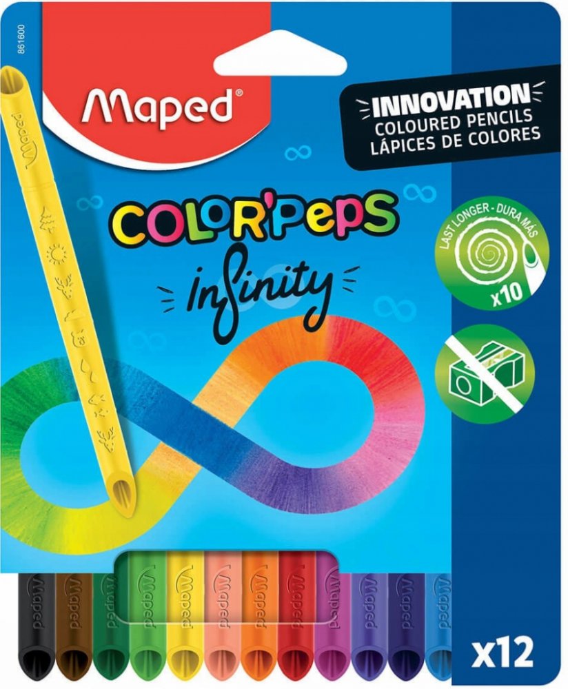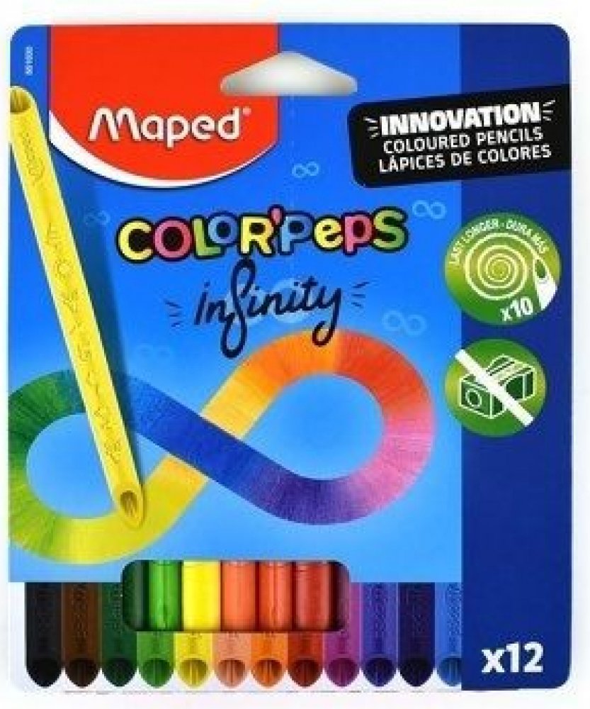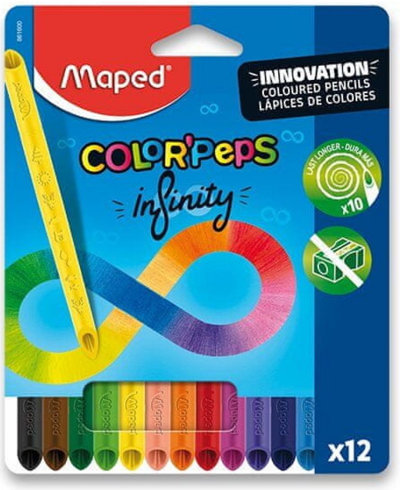 Souprava 12 ks bezdřevých pastelek Maped Color'Peps Infinity s originálním patentovaným designem, který umožňuje kreslit oběma stranami. Pastelky tvoří 100% tuha a není nutné ji ořezávat a mají tedy nulový odpad.
