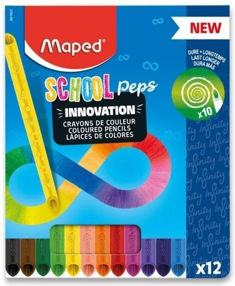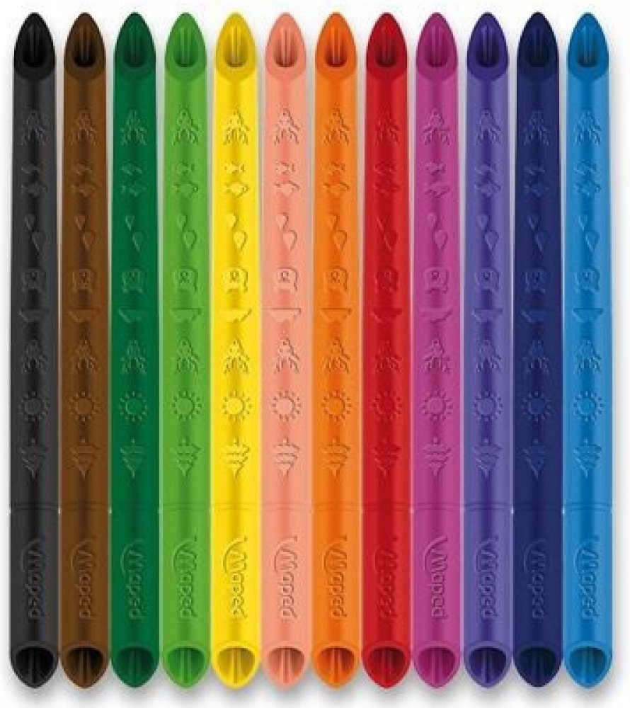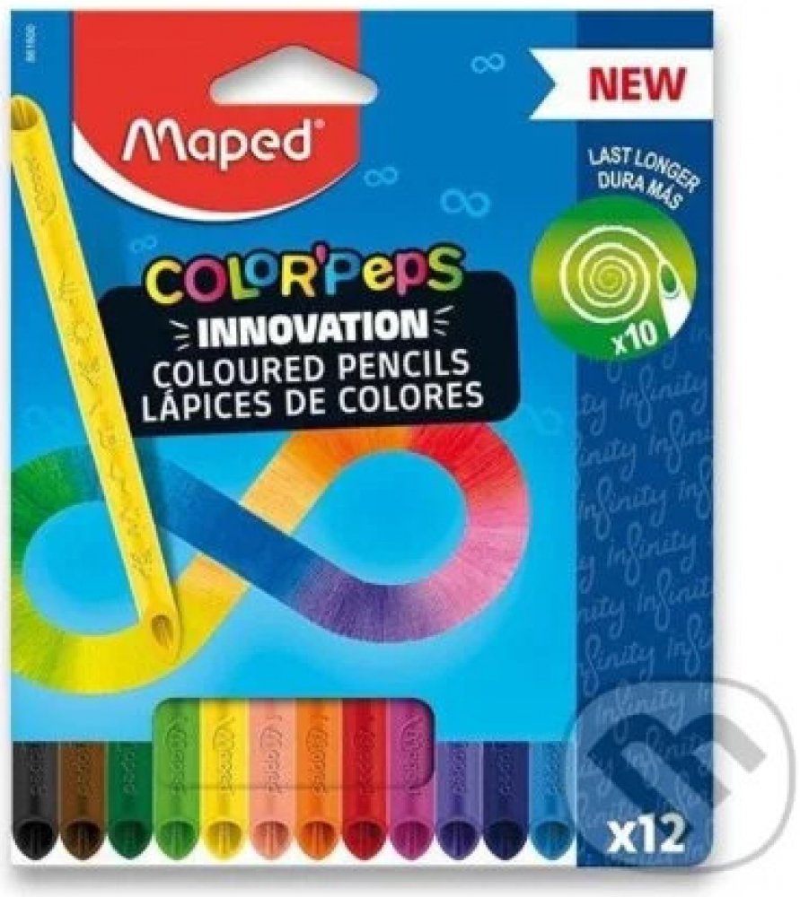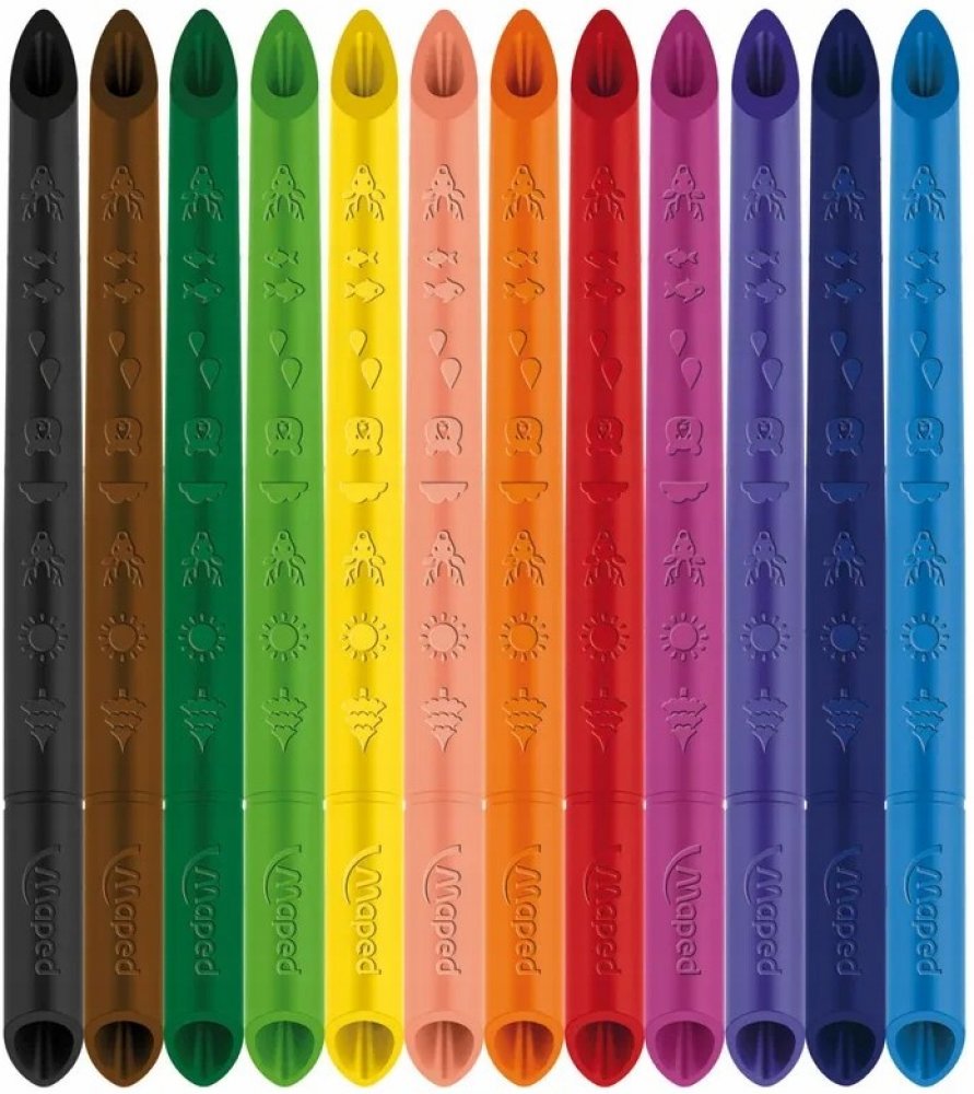 Souprava 12 ks bezdřevých pastelek Maped Color'Peps Infinity s originálním patentovaným designem, který umožňuje kreslit oběma stranami. Pastelky tvoří 100% tuha a není nutné ji ořezávat a mají tedy nulový odpad.