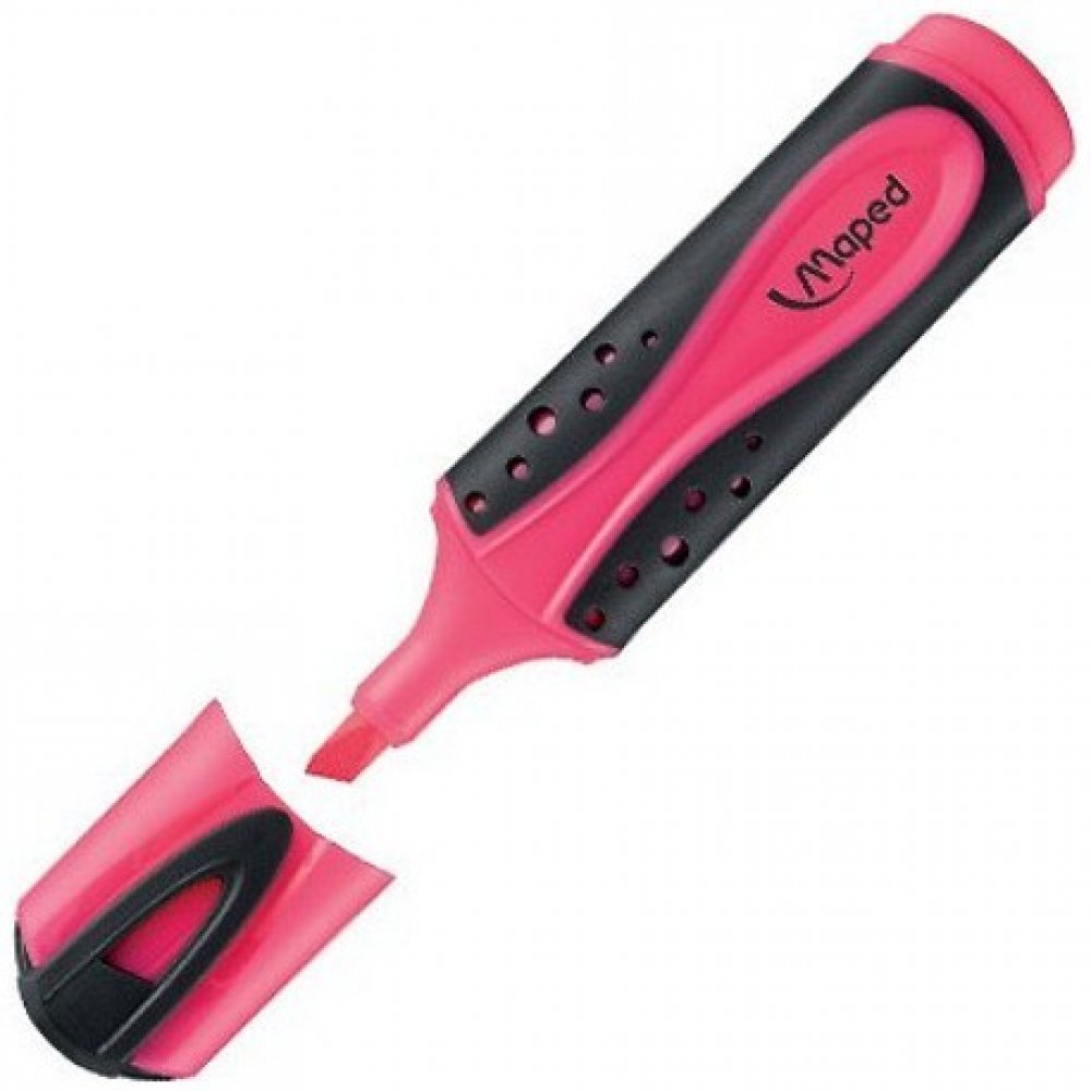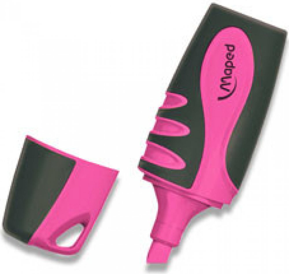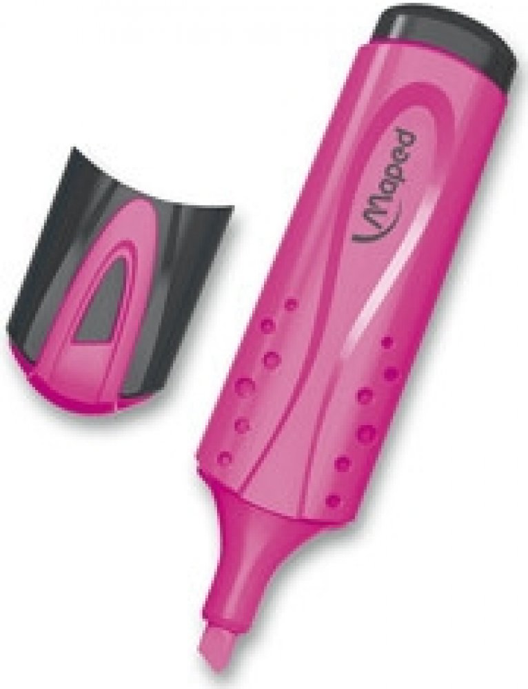 Plochý zvýrazňovač s měkkým úchopem. Uzávěr s klipem. Na všechny druhy papíru. Seříznutý hrot o šíři 1 – 5 mm. Barva stopy - růžová.