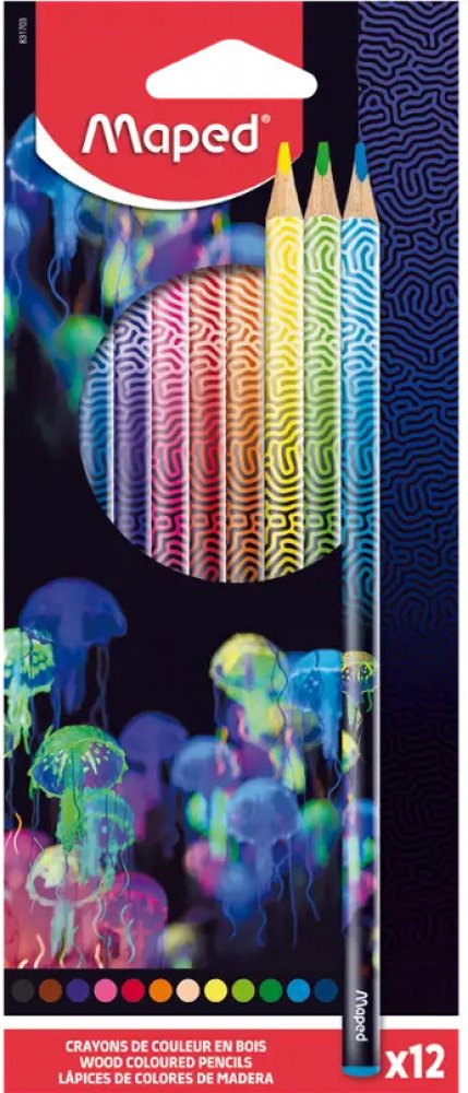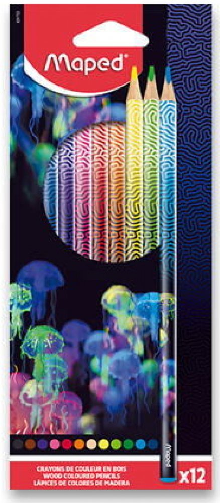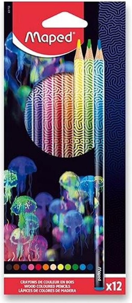Soupravy 12 ks kvalitních dřevěných lakovaných pastelek Maped Deepsea Paradise v atraktivním designu s motivem podmořského světa. Barevná koncovka v barvě pastelky. Trojhranné tělo, měkká a odolná tuha, jasné barvy. Tloušťka tuhy 2,9 mm. Trojhranné tělo, měkká, odolná tuha, jasné barvy.
