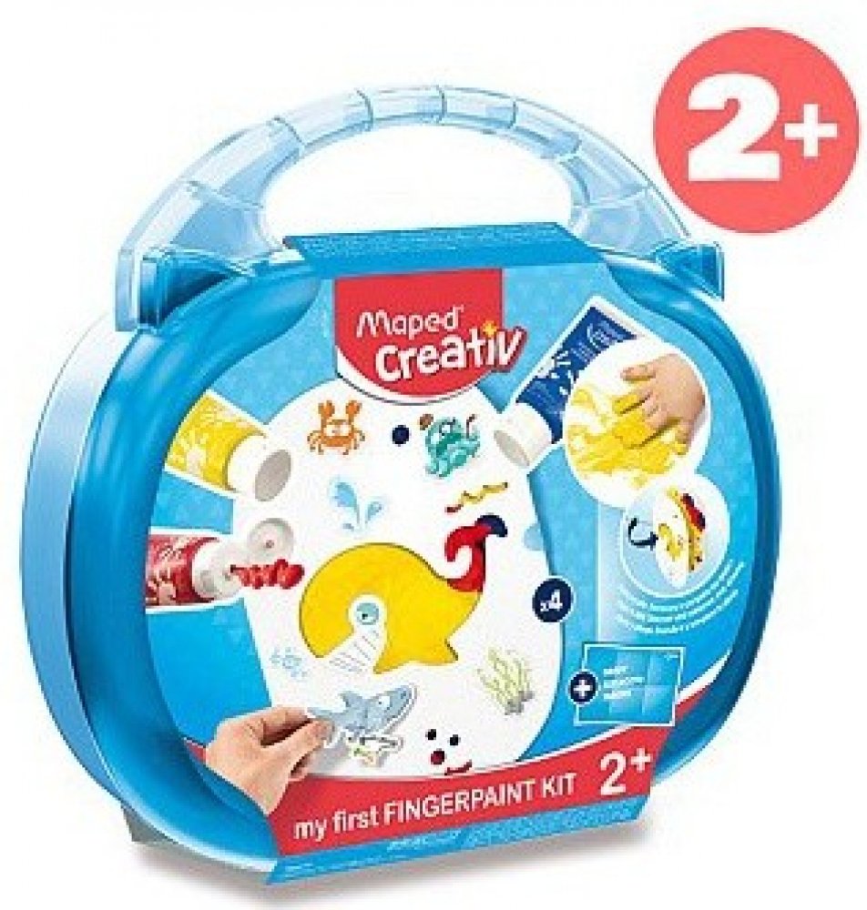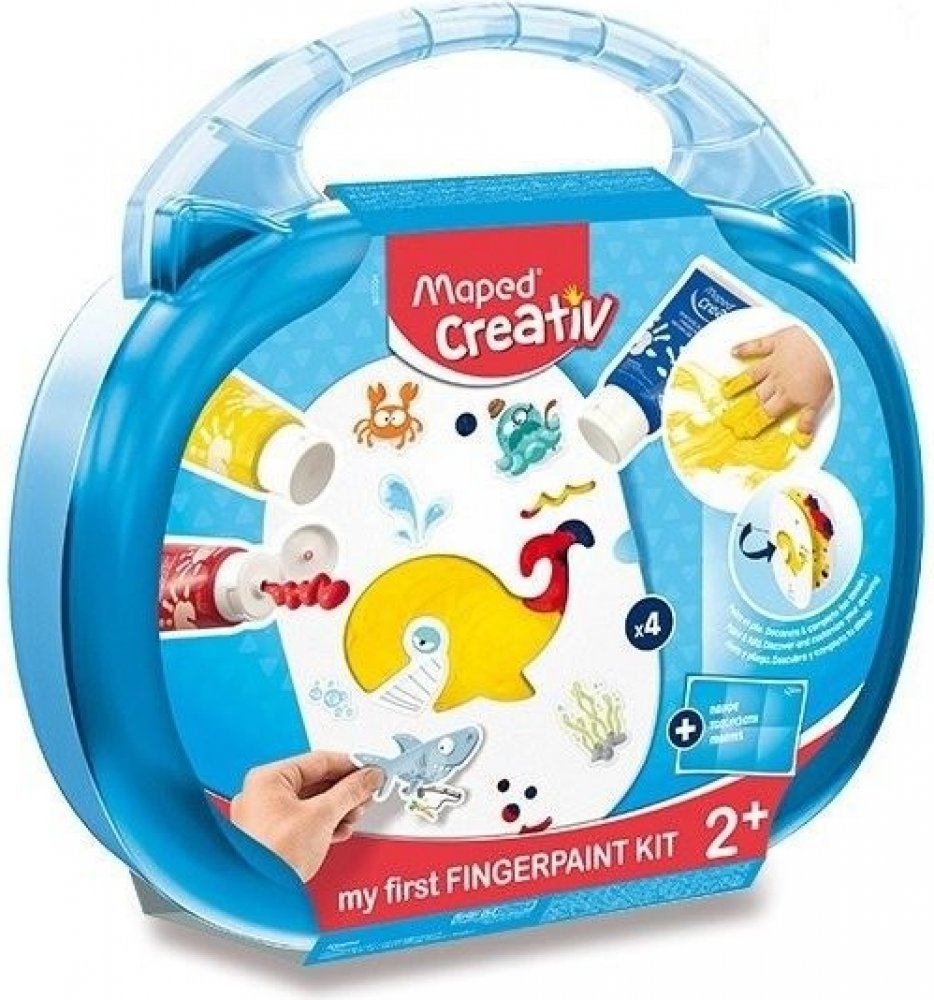 Dětská kreativní souprava obsahuje 3 barvy v tubě pro malování prsty (obsah 75 ml), 4 pracovní listy, 2 sady se samolepkami a 1 textilní podložku. Pracovní listy jsou vyrobené z kartonu a jsou pro jedno použití. Sada je v praktickém kufříku, který snadno otevřou i malé děti